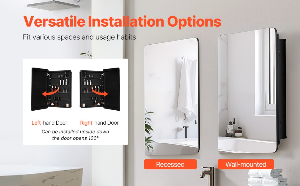 Kaapin voi asentaa joko suoraan seinäpintaan (seinäasennus) tai upottaa seinärakenteeseen. Rakennetta voi kääntää niin, että ovi aukeaa joko oikealle tai vasemmalle, joten kaappi on helppo sovittaa erilaisiin kylpyhuoneisiin ja asetteluihin.