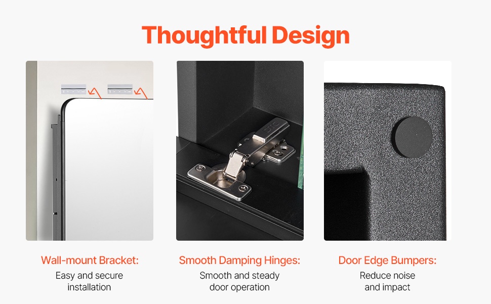 Seinäkiinnike helpottaa kaapin asennusta ja parantaa sen vakautta. Pehmeästi liikkuvat, vaimennetut saranat tekevät oven avaamisesta ja sulkemisesta miellyttävän hiljaista. Laadukkaat vaimennustyynyt pienentävät sulkeutumisesta syntyvää ääntä ja iskua.