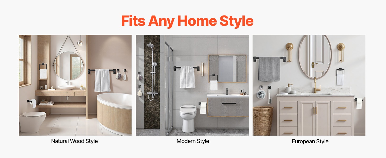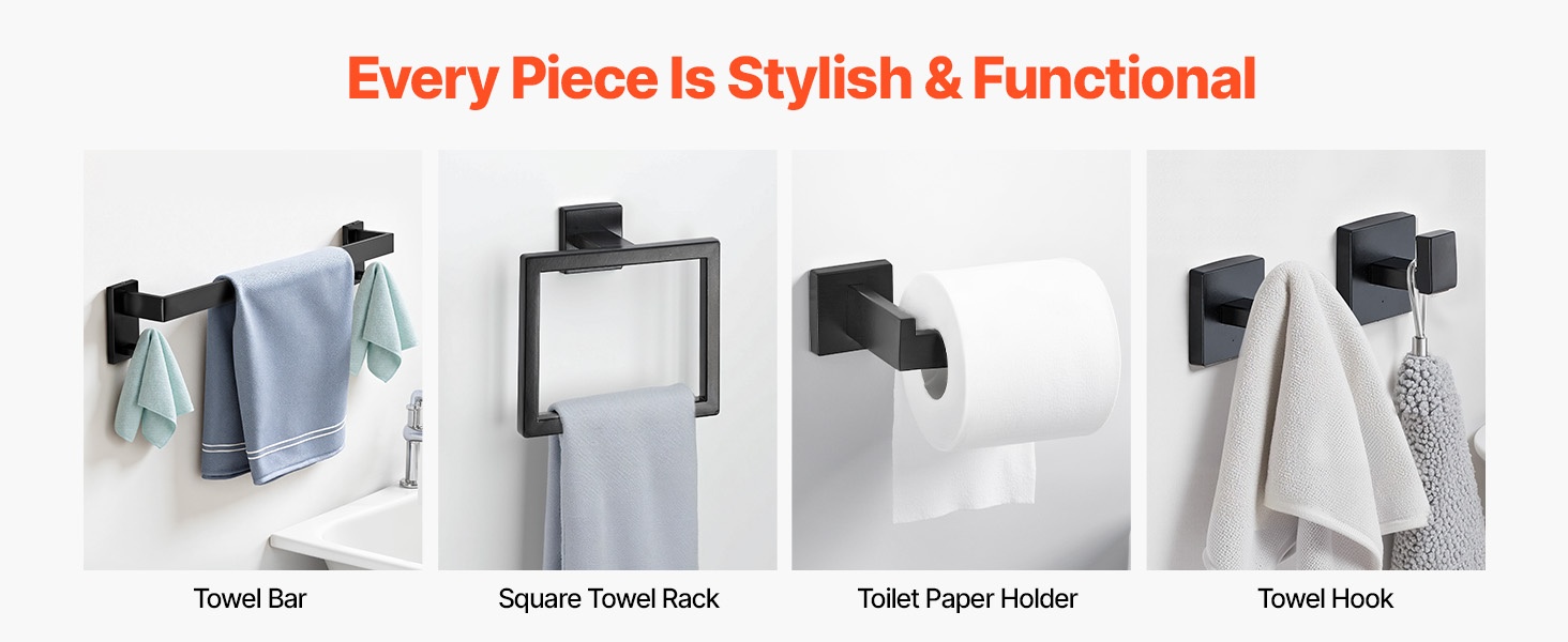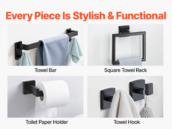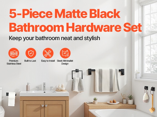Tämä mattamusta kylpyhuonetarvikesarja auttaa pitämään pyyhkeet ja muut tarvikkeet järjestyksessä ja helposti saatavilla. Yhdestä paketista saat yhteensopivat osat, joilla kylpyhuone pysyy siistinä ilman erillisiä hankintoja.