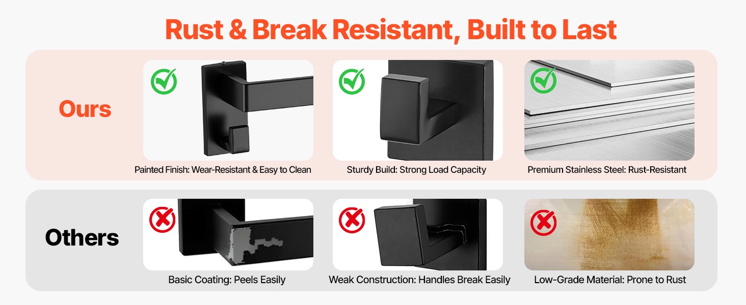 Pyyhetankosarja on valmistettu korkealaatuisesta ruostumattomasta teräksestä (SUS201), joka on kulutusta kestävä, naarmuuntumista ehkäisevä ja ruostumaton. Se on suunniteltu kestämään kosteissa kylpyhuoneolosuhteissa ja pitkäaikaiseen käyttöön.