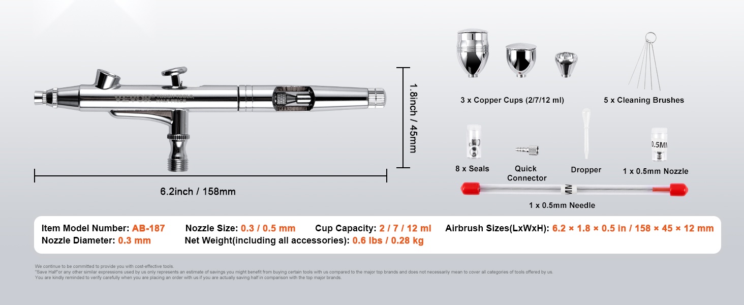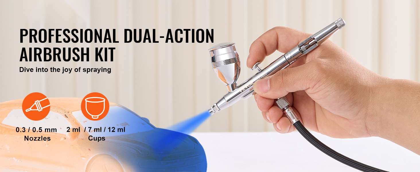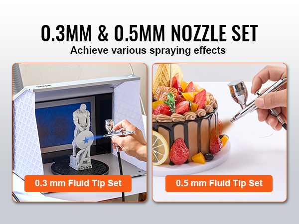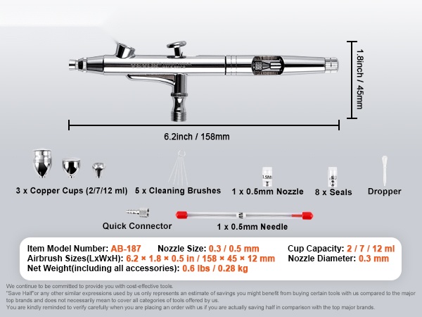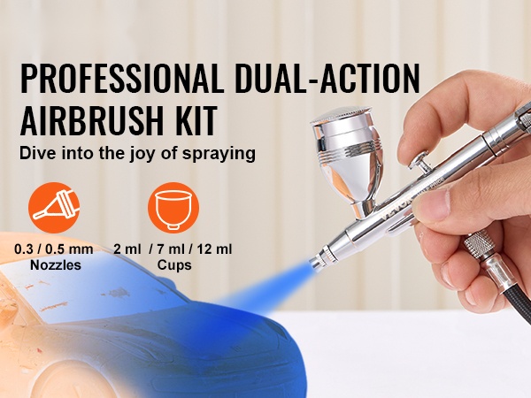 Painovoimasyöttöinen kynäruiskusarja sisältää kaksi suutinkokoa, 0.3 mm ja 0.5 mm, jotta voit valita tarkempaan yksityiskohtatyöhön tai peittävämpään ruiskutukseen sopivan vaihtoehdon. Mukana on täydellinen neulaventtiilin tiivistesarja, jonka avulla säilytät ruiskutuksen suorituskyvyn vaihtamalla tiivisteet tarpeen mukaan.