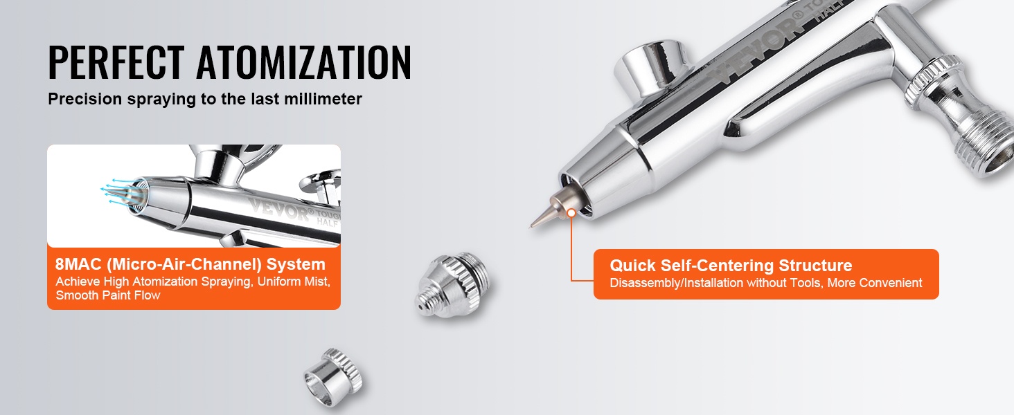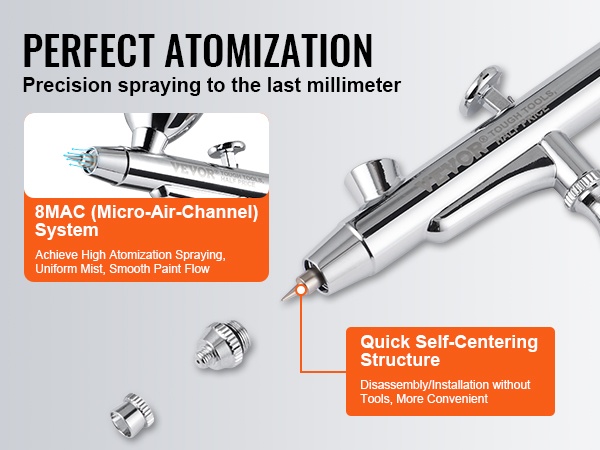 Kaksoistoiminen kynäruisku hyödyntää nopeasti itsekeskittyvää rakennetta ja 8 MAC (Micro-Air-Channel) -järjestelmää. Upotettu suutinkokonaisuus on helppo irrottaa ilman avainta. Korkea sumutusaste varmistaa tasaisen ruiskutuksen ja sujuvan maalin tai väriaineen virtauksen.