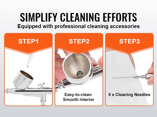 Painovoimasyöttöinen kynäruiskusetti sisältää 5 puhdistusneulaa, joilla puhdistus käy nopeasti ja perusteellisesti ilman lisätyökaluja. Myös ahtaat kulmat ja pienet osat saa puhdistettua kunnolla. Kupeissa on sileät sisäpinnat, jotka ehkäisevät maalin tarttumista ja helpottavat puhdistusta.