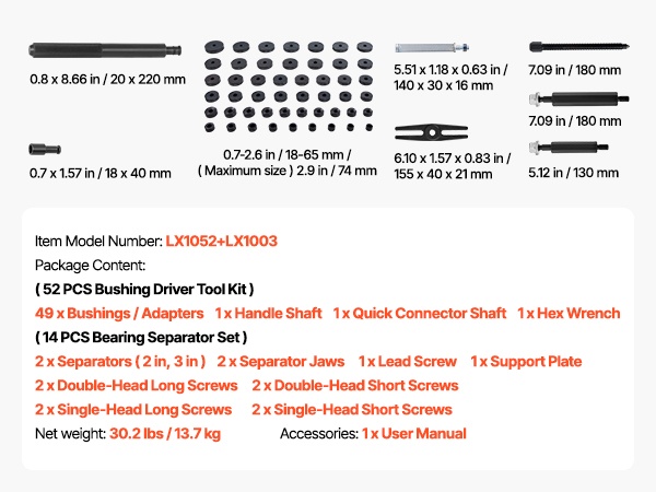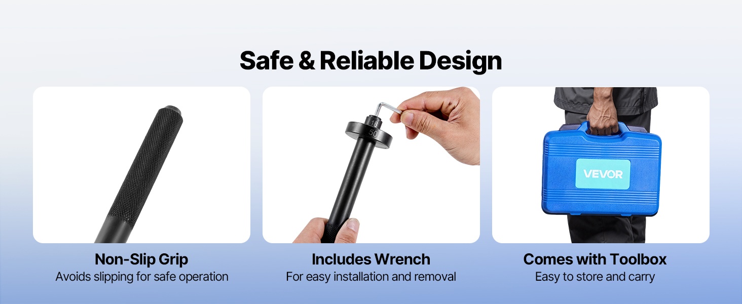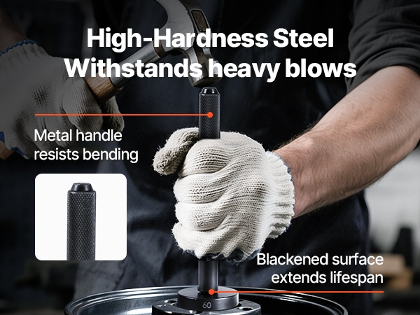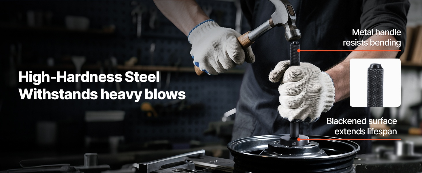 Laakeri- ja tiivisteasennussarja on valmistettu tukevasta metallista, jossa on ruostumista kestävä musta pintakäsittely. Pidennetty ja paksunnettu kahva tarjoaa tukevan otteen ja helpottaa laakereiden irrotusta ja asentamista.