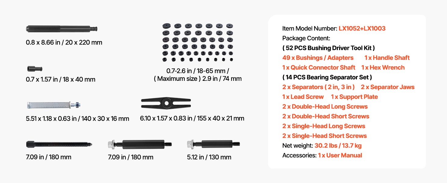 Sarja kattaa yleisimmät holkkilevyjen koot, joten voit valita tarkasti sopivan koon pienille laakereille polkupyörissä ja moottoripyörissä sekä autonlaakereille. Tämä helpottaa sekä laakerien asennusta että purkamista.