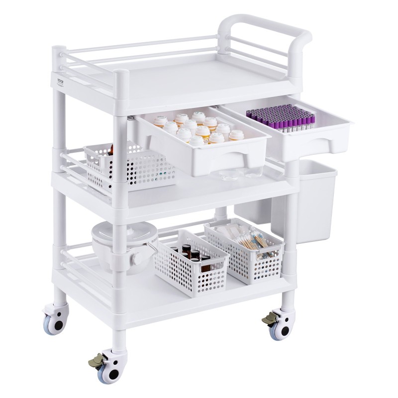 Tämä kolmitasoinen laboratoriokärry helpottaa tarvikkeiden järjestelyä ja siirtämistä laboratorioissa, klinikoilla, sairaaloissa ja kauneushoitoloissa. Kantavuus on korkea, rakenne on vakaa ja kärry liikkuu kevyesti myös ahtaissa tiloissa.