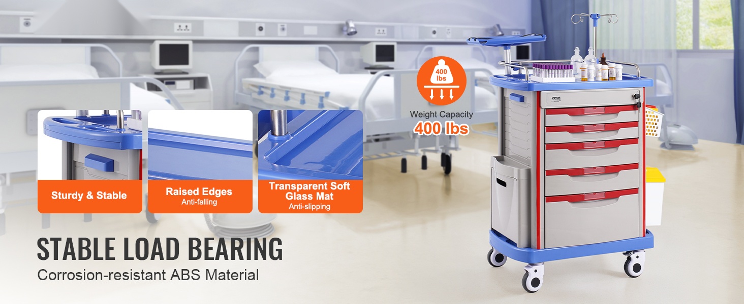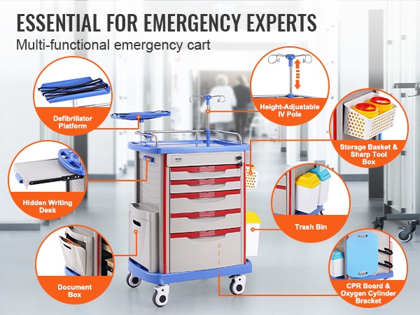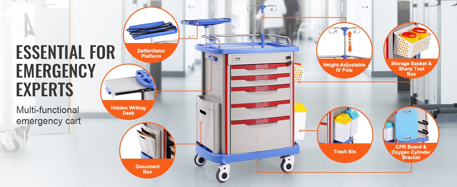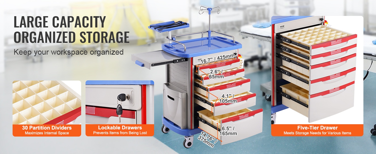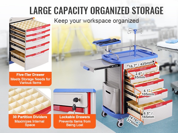 Sivukahvoilla varustetut tasot helpottavat vaunun käsittelyä. Kaksitasoiset tarjotin- ja laatikkoratkaisut helpottavat usein käytettyjen tarvikkeiden pitämistä helposti saatavilla, mikä tehostaa työtä ja vähentää turhaa liikkumista.