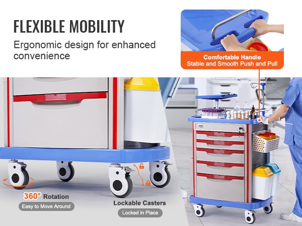 Neljä hiljaista, kulutusta kestävää TPR-pyörää takaavat tasaisen liikkeen. Pyörät mahdollistavat 361° kääntyvyyden, ja kahdessa pyörässä on jarrut vaunun turvallista paikalleen lukitsemista varten. Ergonomiset kahvat helpottavat vaunun ohjausta kapeissa käytävissä ja potilastiloissa.