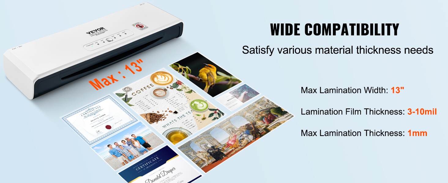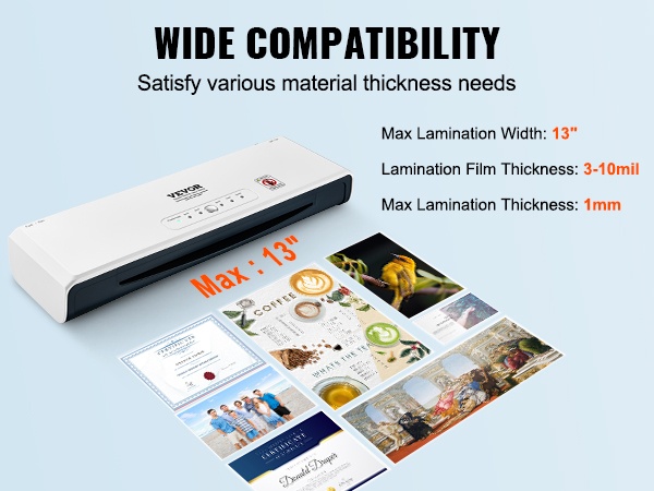 Laitteella voi laminoida materiaaleja jopa 13-tuumaisella (330 mm) leveydellä. Säädettävä kalvon paksuusalue 80~250mic mahdollistaa erilaisten asiakirjojen ja laminaattikalvojen käytön.