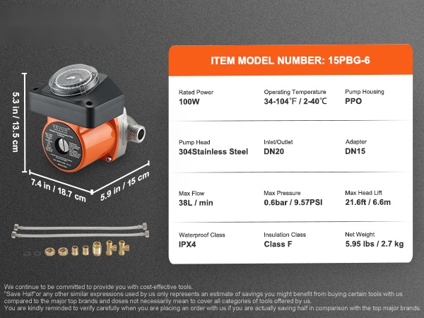 Lämminvesikiertopumppu DN20 sisääntulo ja ulostulo DN15-sovittimella 100 wattia 304 ruostumatonta terästä