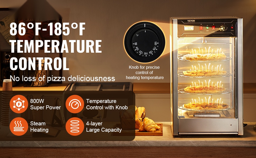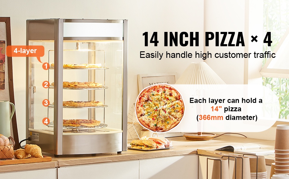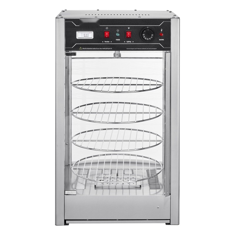 Lasivitriinillä varustettu lämpökaappi yhdistää tehokkaan lämmönsäilytyksen ja selkeän esillepanon. Nelitasoinen pyörivä rakenne pitää esimerkiksi 14-tuumaiset pizzat tasaisesti lämpiminä ja hyvin näkyvillä ravintoloissa, pikaruokapaikoissa, kahviloissa ja hotelleissa.