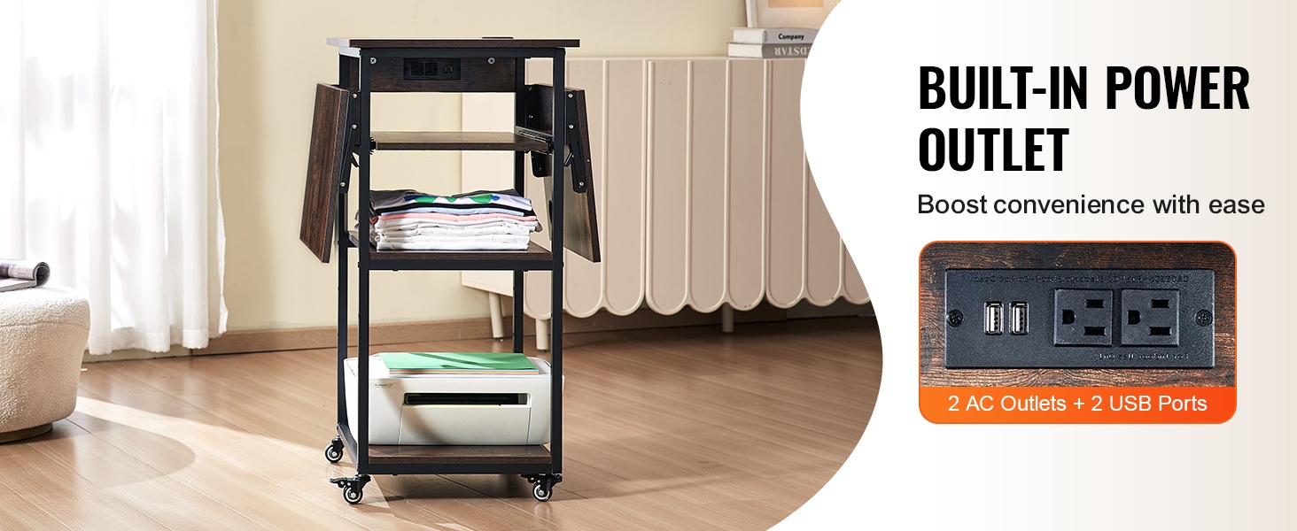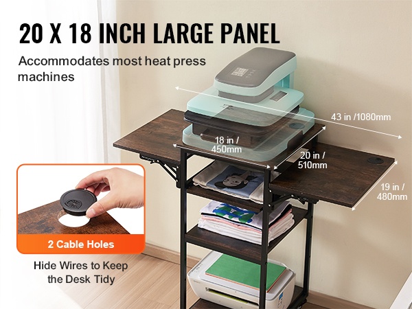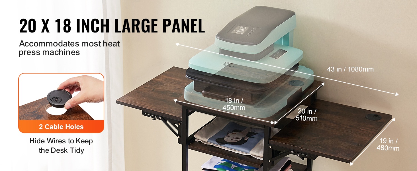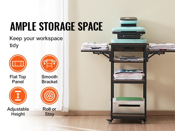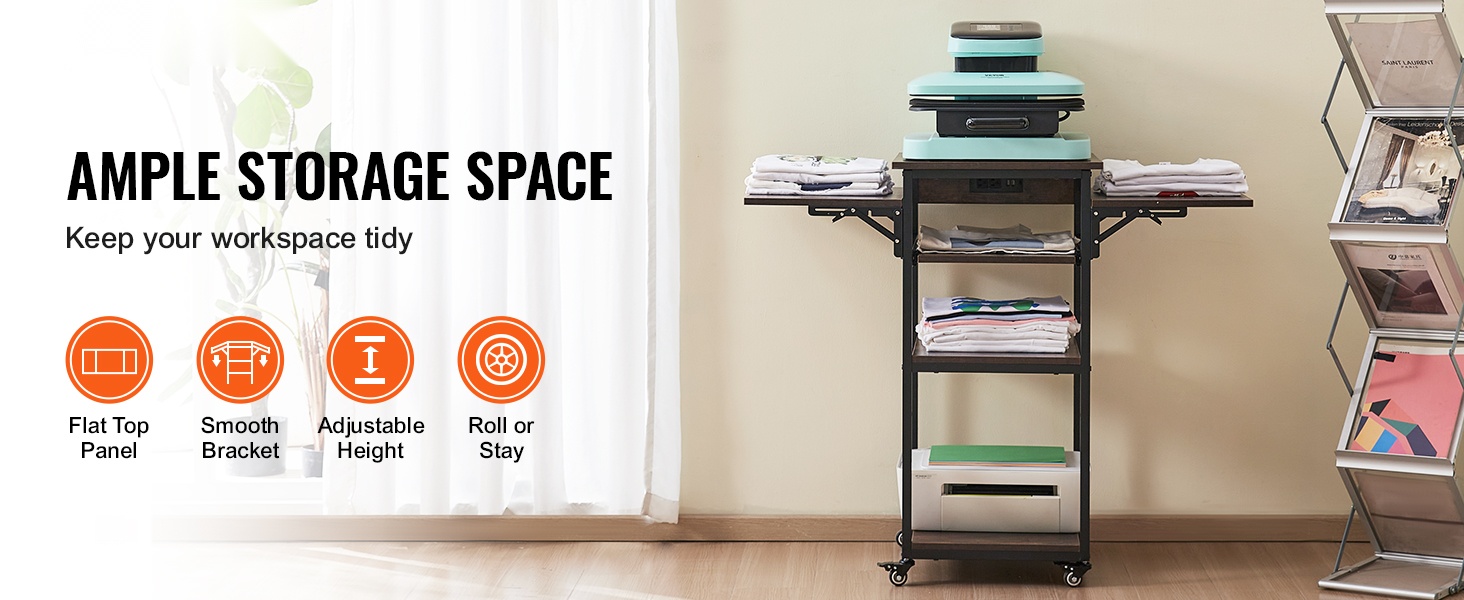 Siirrettävä kolmitasoinen lämpöprässäyspöytä tarjoaa runsaasti säilytystilaa lämpöprässille, tulostimelle, vinyylirullille ja muille tarvikkeille. Taitettava sivupöytä lisää työskentelytilaa silloin, kun sitä tarvitaan, ja kääntyy pois tieltä säilytyksen ajaksi.