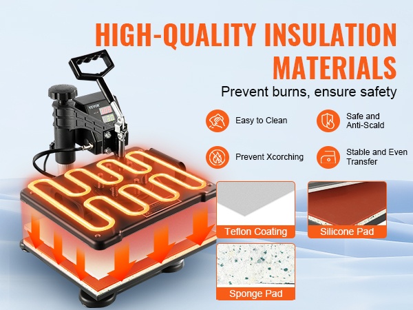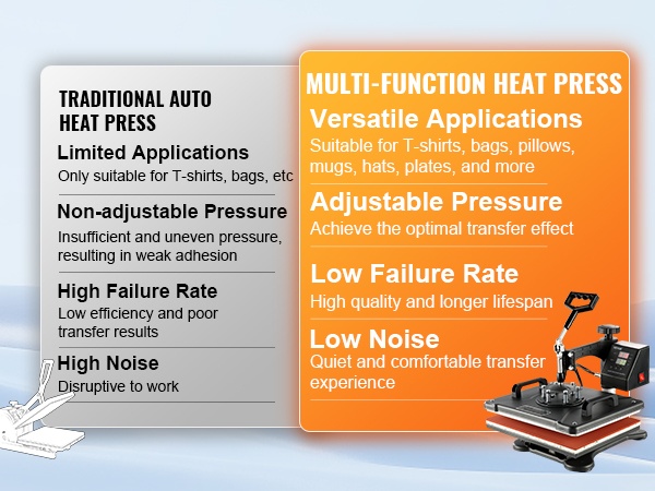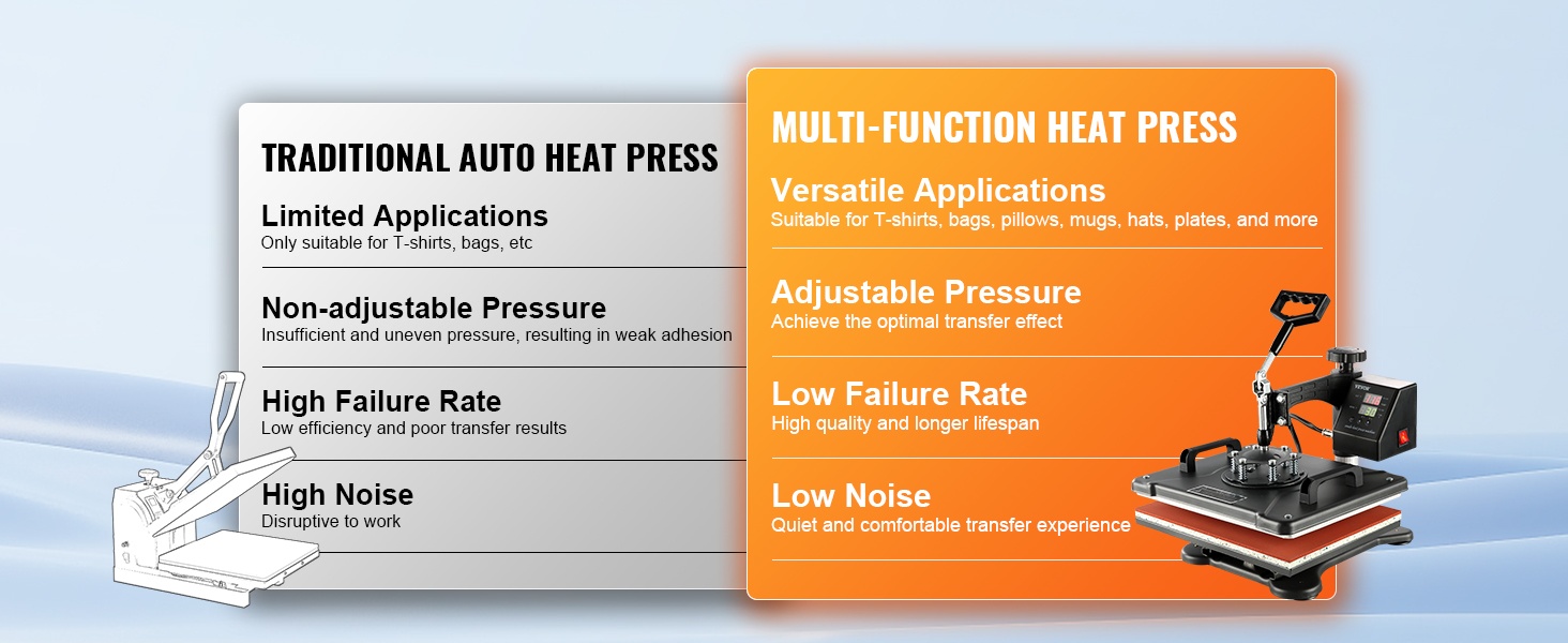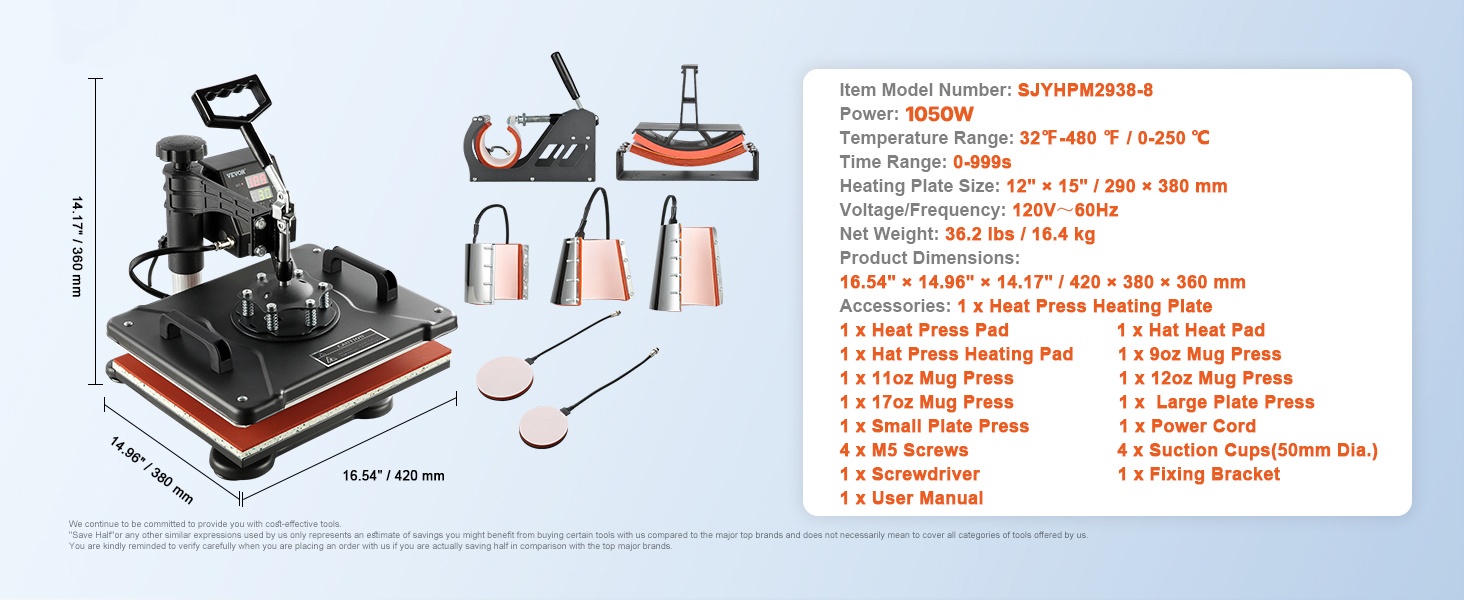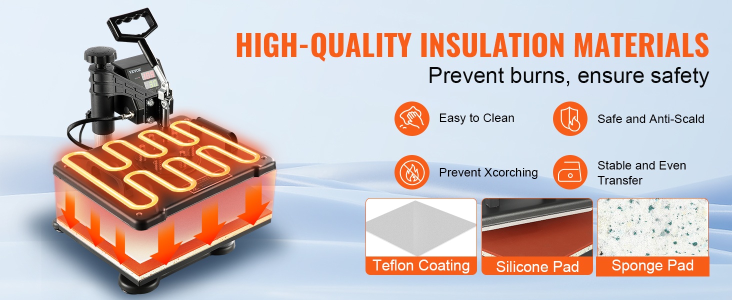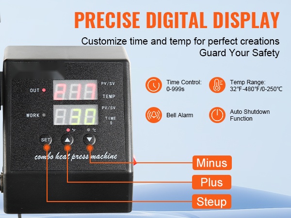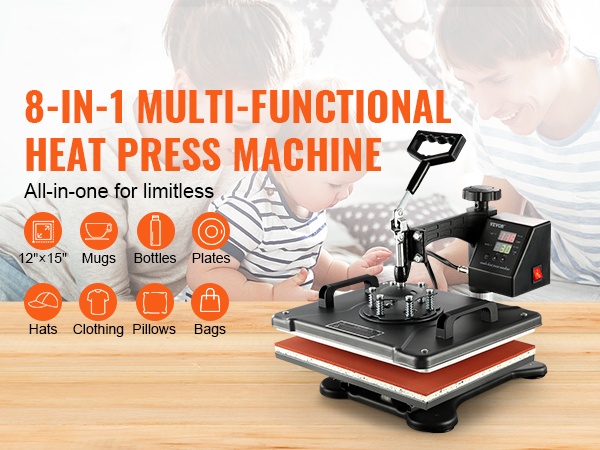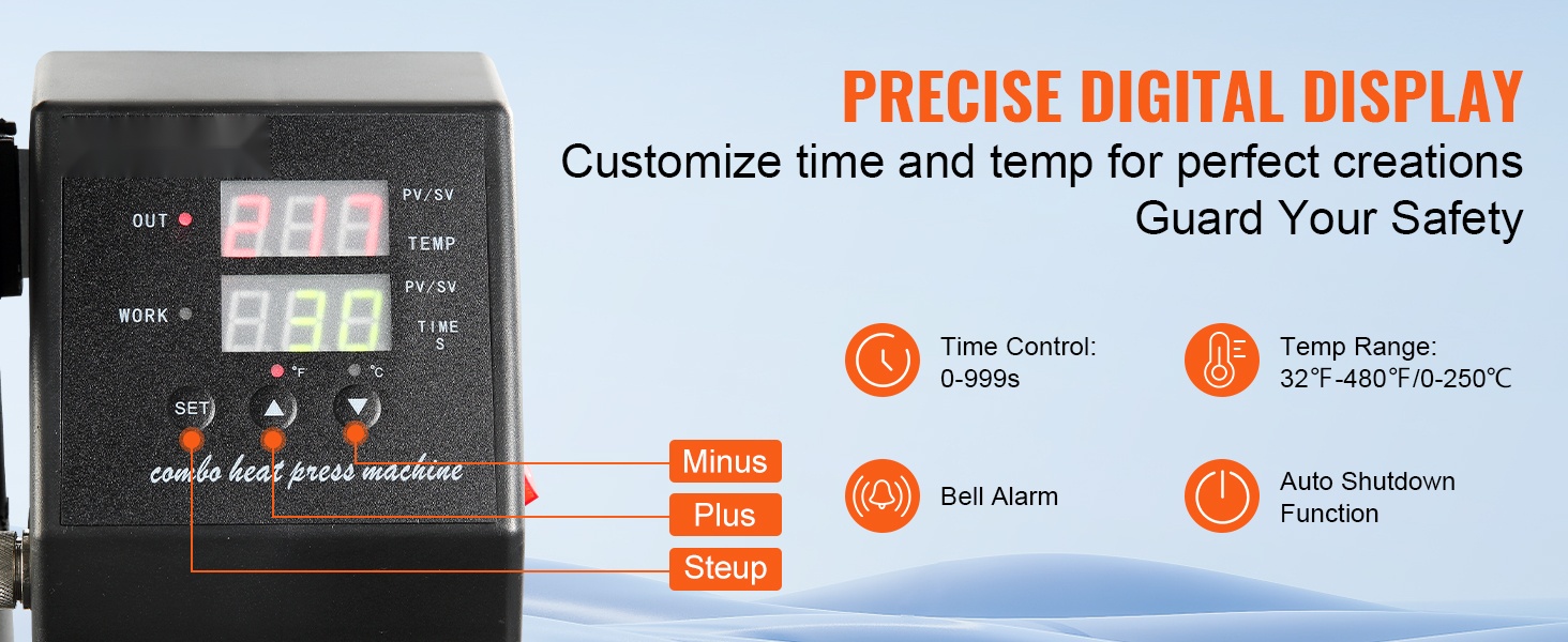 Tämä 8 in 1 -lämpöprässikone soveltuu monipuoliseen siirtopainamiseen T-paidoille, mukeille, lippalakeille, hatuille, lautasille ja muille tasaisille ja kaareville pinnoille. Kaksikerroksinen eristystekniikka parantaa lämmönsiirtoa, ja tarkka digitaalinen ohjaus helpottaa lämpötilan ja ajan säätöä.