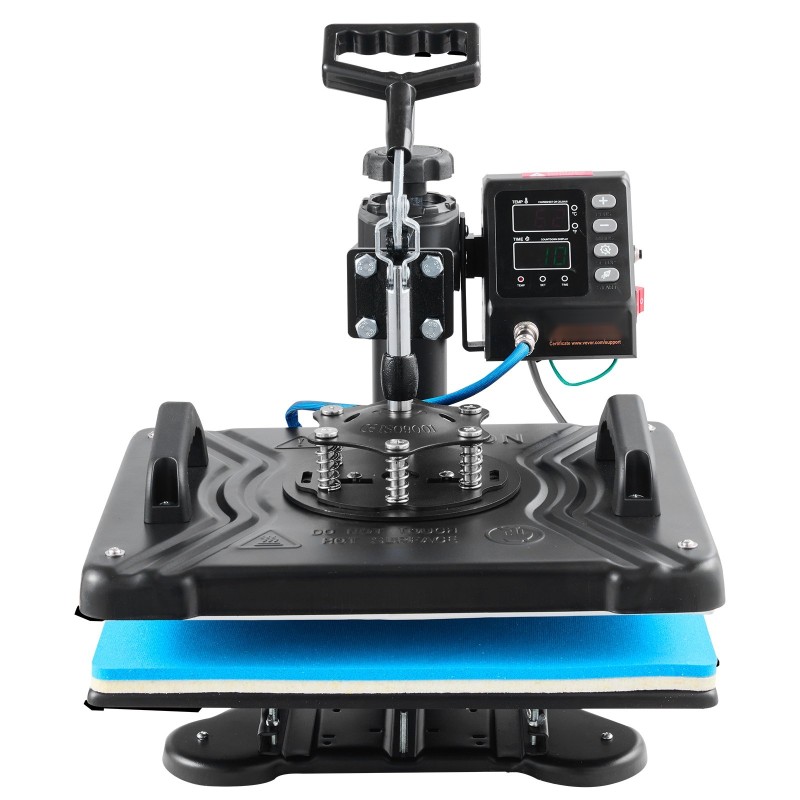 Monipuolinen 10-in-1 lämpöprässikone, jossa on teflon-pinnoitettu 12" x 15" (30 x 38 cm) lämmityslevy ja tasainen lämmönjako koko pinnalle. Mukana useita vaihtopäitä, joilla voit siirtokuvata T-paitoihin, lippiksiin, mukeihin, lautasille, kyniin ja monille muille materiaaleille – sopii esimerkiksi kodin sisustukseen, personoituihin lahjoihin ja pienimuotoiseen tuotantoon.