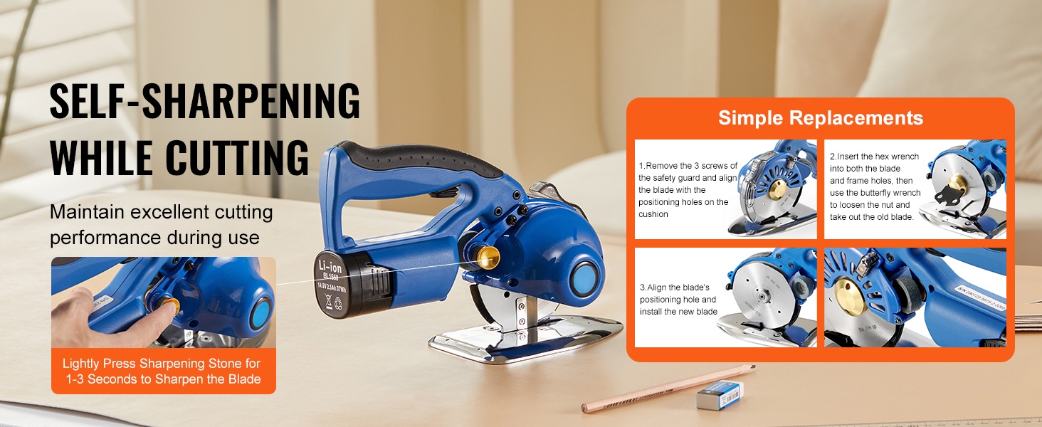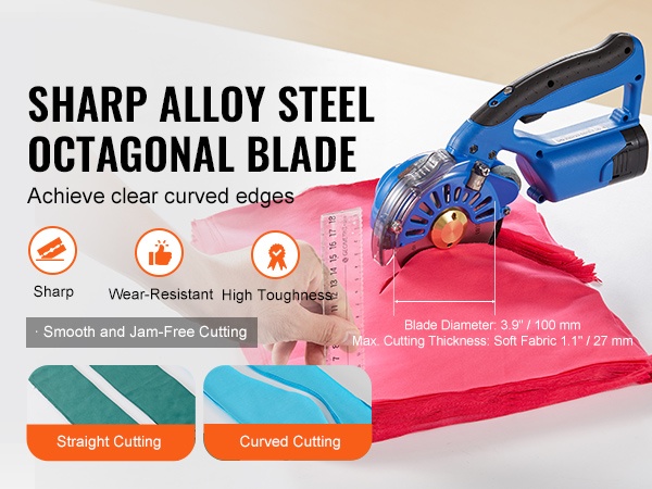 Sähkökäyttöisessä kankaanleikkurissa on kestävästä seosteräksestä valmistettu 3.9" / 100 mm kahdeksankulmainen terä, joka säilyttää terävyytensä ja kestää kulutusta. Laite leikkaa pehmeää ja joustavaa kangasta jopa 1.1" / 27 mm paksuuteen asti, myös kaarevia leikkuulinjoja pitkin, ilman terän lohkeilua.