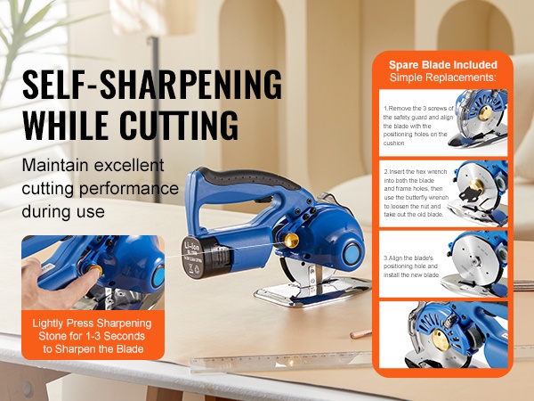 Leikkurissa on sisäänrakennettu itseteroitusmekanismi: terä pysyy terävänä, kun teroituskiveä painetaan 1–3 sekunnin ajan käytön aikana. Mukana tulee myös varaterä pidempää käyttöikää varten. Voiteluöljyn säiliöjärjestelmä helpottaa terän voitelua ja pitää käytön sujuvana, kun öljyä lisätään ajoissa.