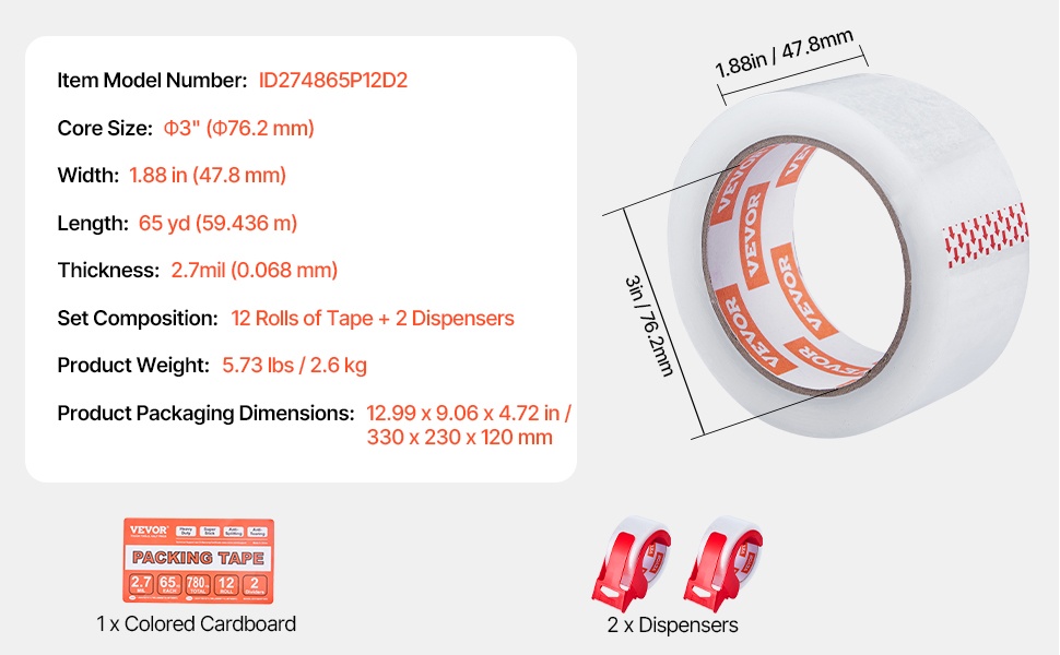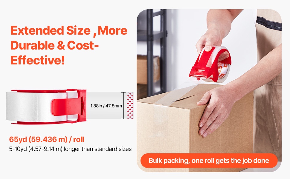 Pakkaus sisältää 24 rullaa teippiä, joissa jokaisessa on 3-tuumainen hylsy. Yhden rullan pituus on 65yd / 59.436m, eli noin 5–10yd / 4.57–9.14m enemmän kuin useissa tavanomaisissa vaihtoehdoissa. Pidempi rulla vähentää vaihtotarvetta ja tekee pakkaamisesta sujuvampaa ja kustannustehokkaampaa.