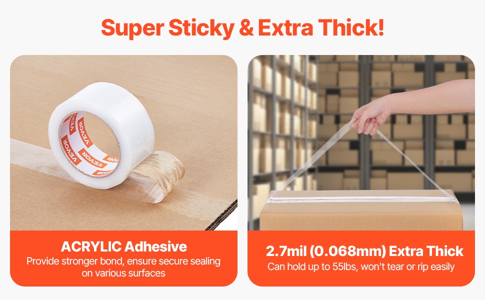 Teipin paksuus on 2.7mil (0.068 mm), ja siinä käytetään vahvaa akryyliliimaa, joka tarjoaa pitkäkestoisen pidon. Teippi pitää pakkaukset tiiviisti suljettuina myös raskaassa käsittelyssä ja vaativissa kuljetusolosuhteissa. Hyvä paksuus ja kestävyys auttavat ehkäisemään repeämistä ja halkeilua.