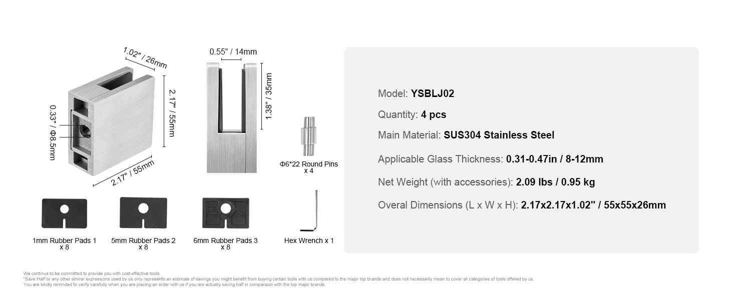 - Soveltuva lasin paksuus: 0.31-0.47in / 8-12mm