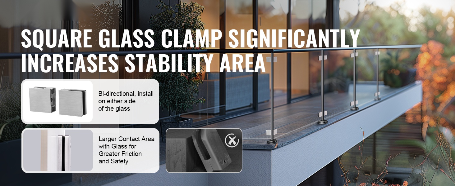Neliönmuotoinen kiinnike, jossa on kaksi aukkoa, tarjoaa paremman tuen ja korkean kantavuuden. Suurempi kosketuspinta lasin ja kiinnikkeen välillä lisää vakautta ja turvallisuutta etenkin kaide- ja suojalasi-asennuksissa.
