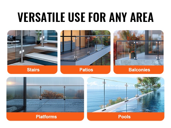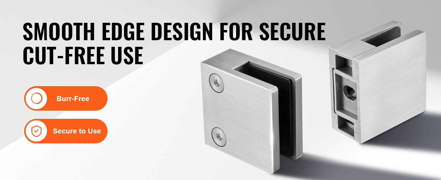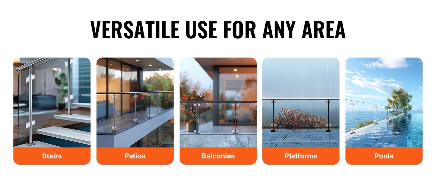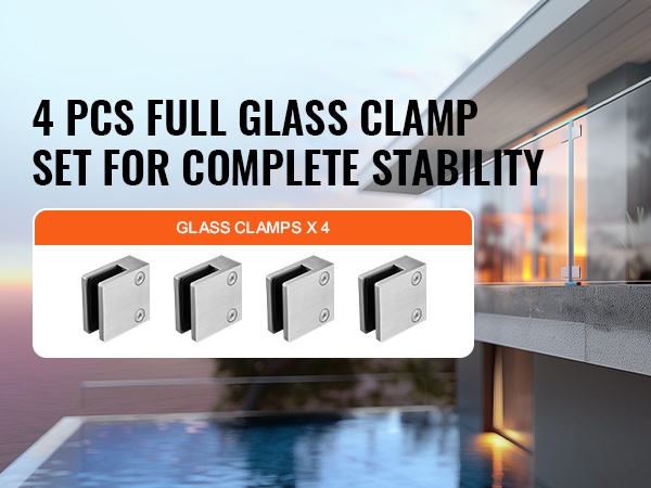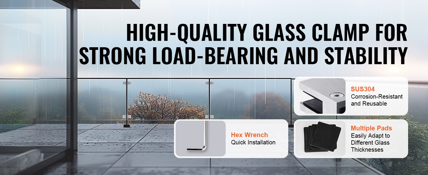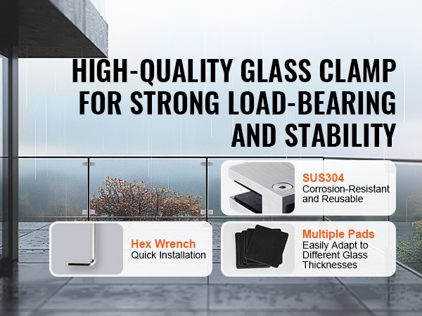Kiinnike on valmistettu laadukkaasta SUS304-ruostumattomasta teräksestä, joka kestää hyvin sään vaihtelut ja korroosion. Materiaali on pitkäikäinen ja sopii sekä sisä- että ulkokäyttöön. Kiinnikettä voidaan käyttää uudelleen ja se mukautuu eri lasipaksuuksiin mukana tulevien osien avulla.