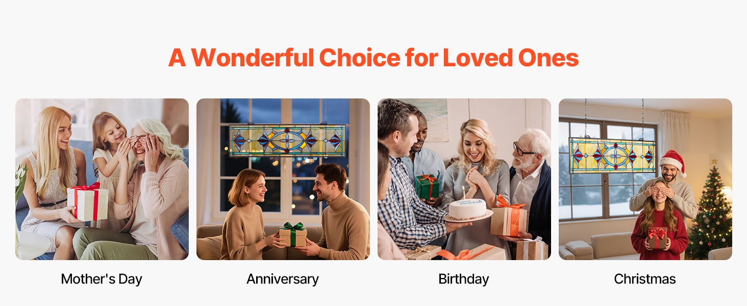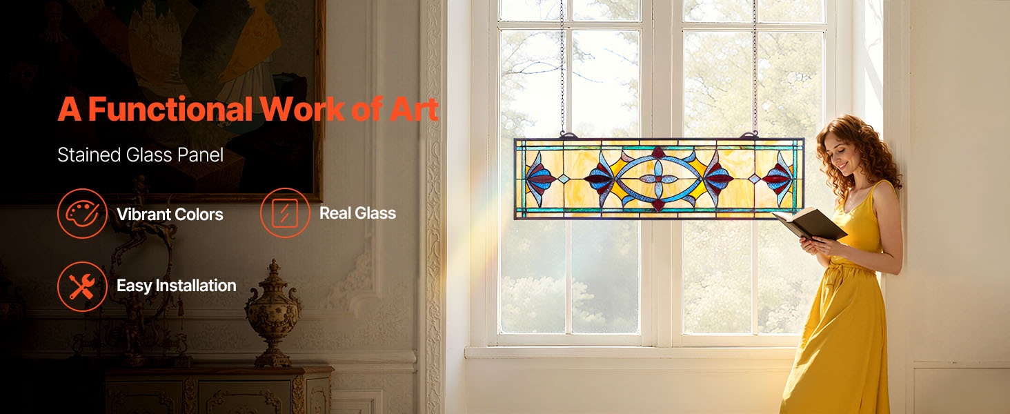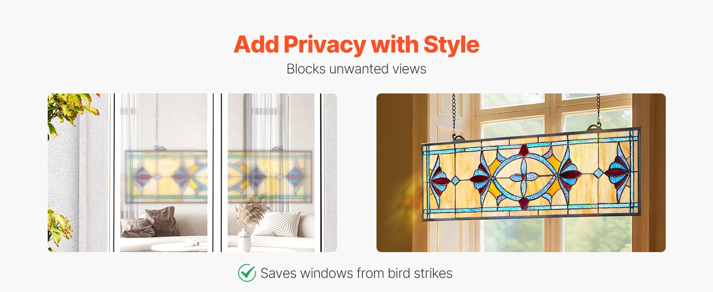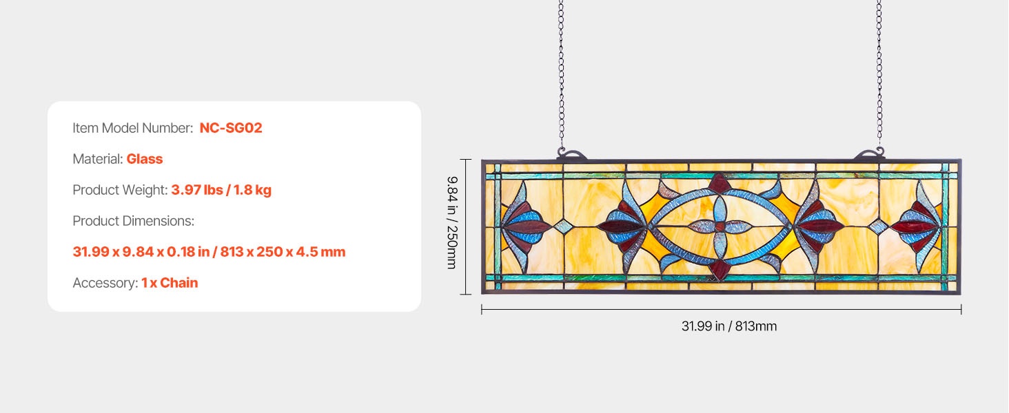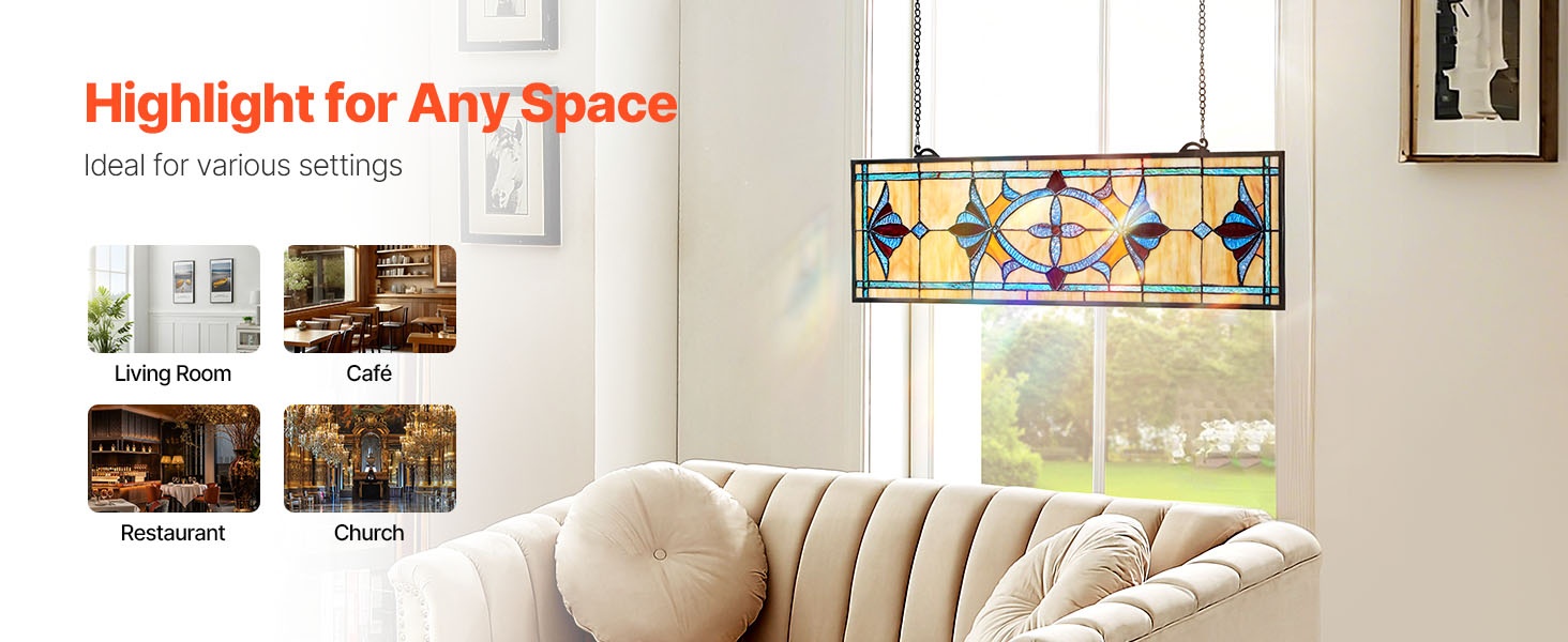 Tämä vaakasuuntainen, ketjulla ripustettava lasimaalausikkunapaneeli tuo kotiin perinteisen Tiffany-tyylisen tunnelman. Värikäs, valoa läpäisevä lasi luo kauniita heijastuksia ja korostaa tilan sisustusta ilman, että myyntiä korostetaan liikaa.