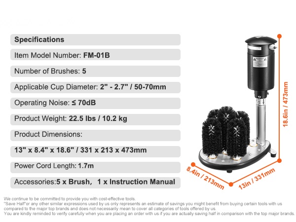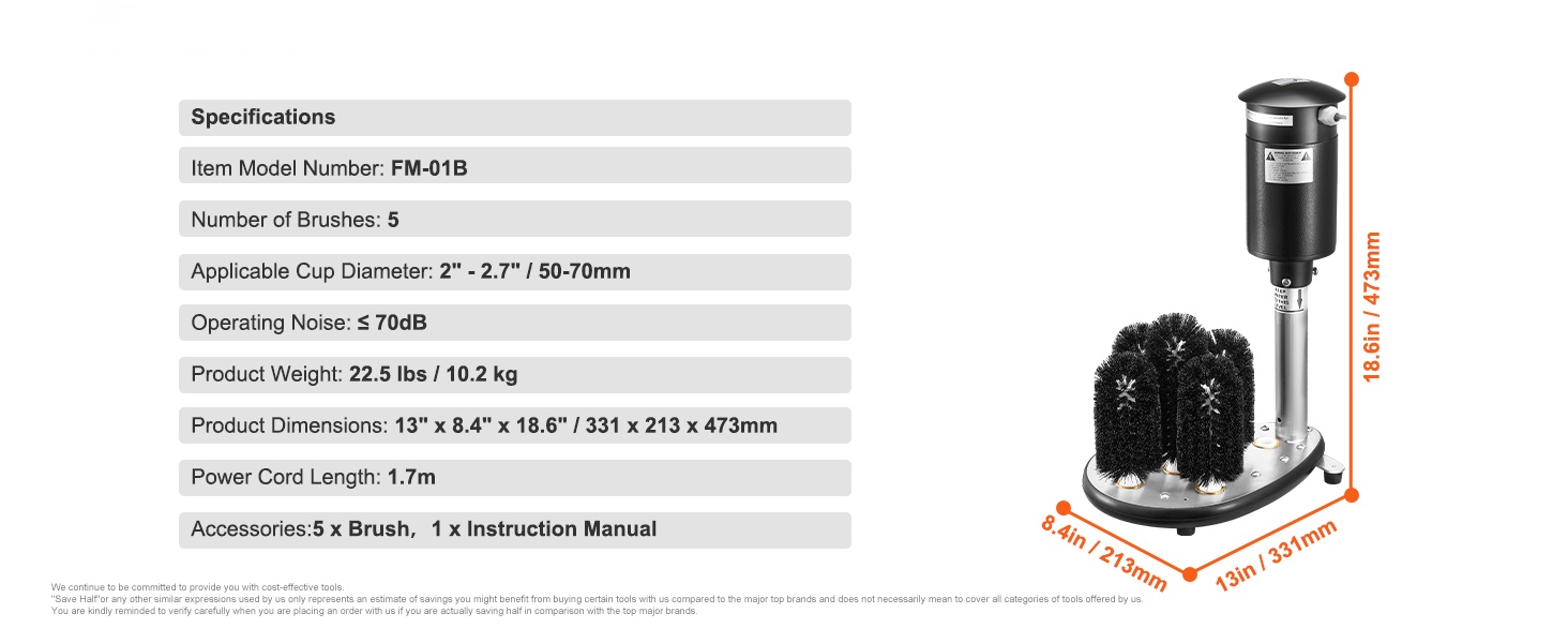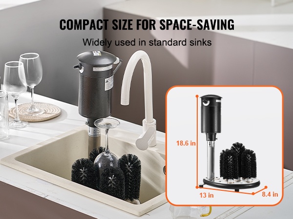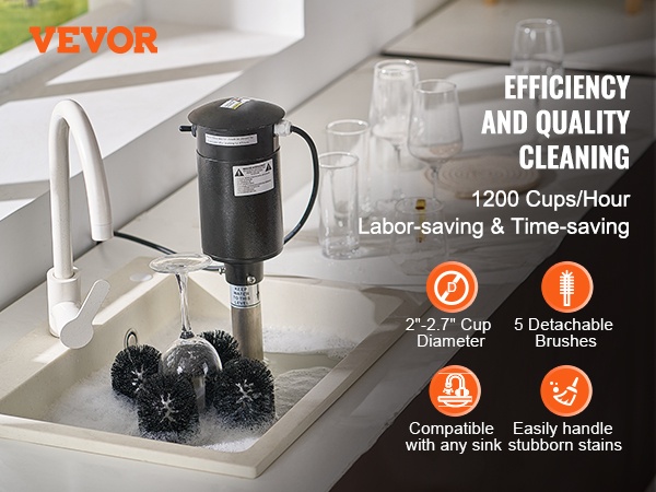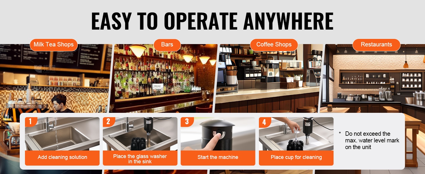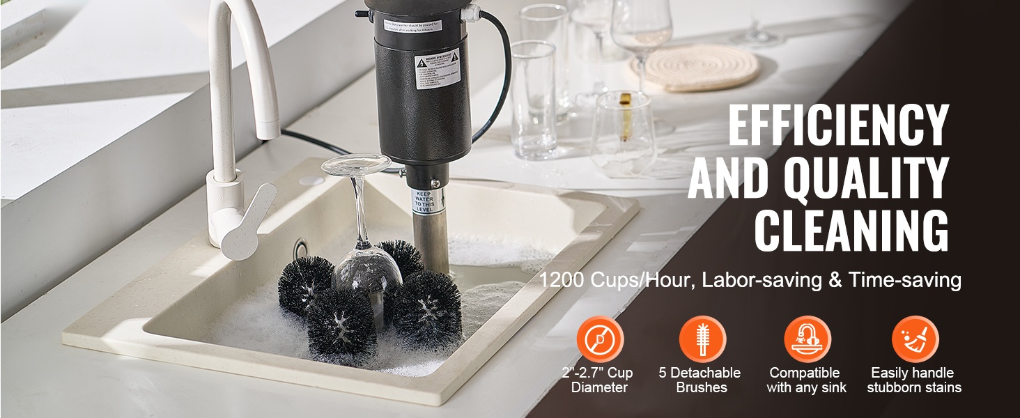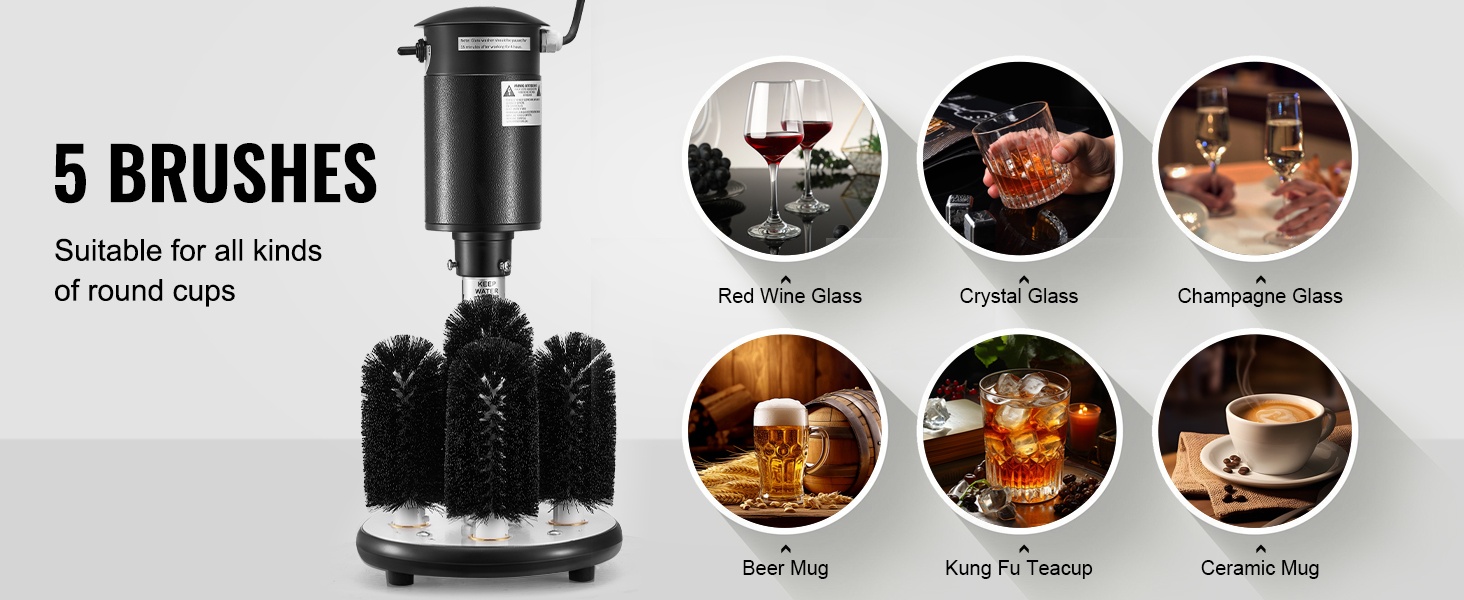 Laitteessa on 5 harjaa, jotka mukautuvat monentyyppisiin pyöreäsuisiin laseihin. Se soveltuu laajasti esimerkiksi samppanjalaseille, olutlaseille, juomalaseille ja mukeille. Ratkaisu toimii hyvin sekä koti- ja juhlakäytössä että ammattimaisessa baarissa tai kahvilassa.