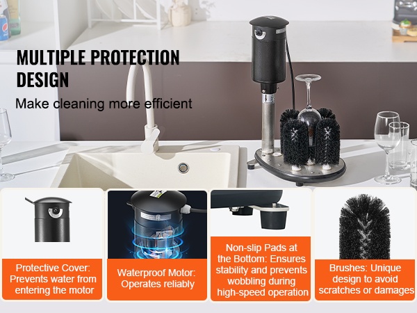 Lasinpesukoneessa on useita suojaominaisuuksia. Tehokas suojakansi ehkäisee veden pääsyn moottoriin, ja ruostumaton teräsmateriaali kestää käyttöä ja ikääntymistä. Pohjassa olevat liukuestejalat parantavat vakautta myös suurilla pyörintänopeuksilla käytettäessä.