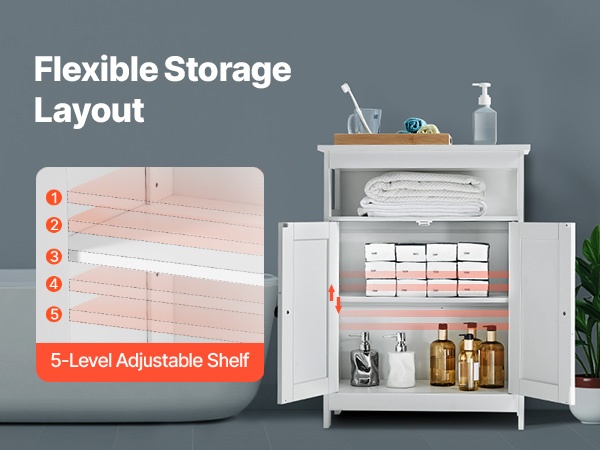 Valmiiksi poratut hyllyreiät mahdollistavat hyllyn korkeuden säätämisen 5 eri tasolle. Näin kaappiin mahtuvat esimerkiksi saippuakupit, ihonhoitotuotteet, pyykinpesuaineet, pyyhekori ja monet muut tarvikkeet, ja tila on helppo mukauttaa tarpeen mukaan.