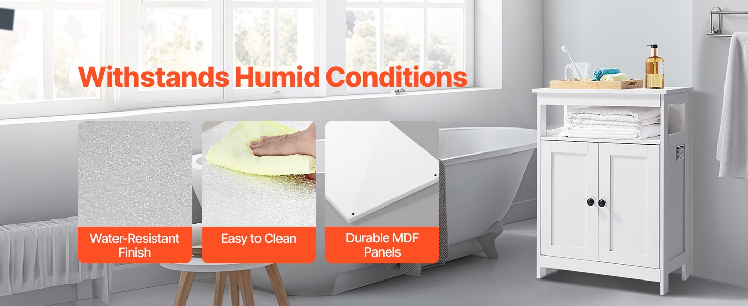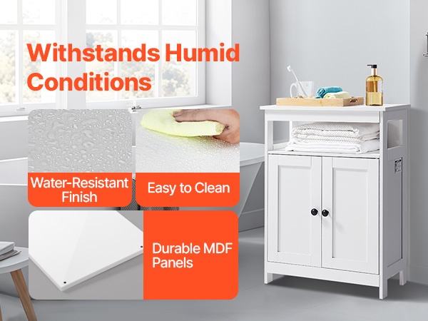 Kaappi on valmistettu laadukkaasta P2 MDF -levystä ja sen pinnassa on vesitiivis pinnoite, joka kestää kosteaa kylpyhuoneympäristöä. MDF:n tasainen tiheys ja tiivis sisäinen rakenne tekevät siitä vahvemman ja vakaamman kuin tavallinen puu tai muovi, eikä se helposti väänny tai halkeile.
