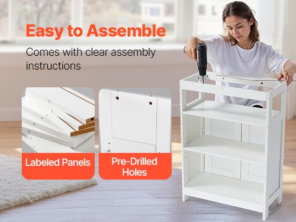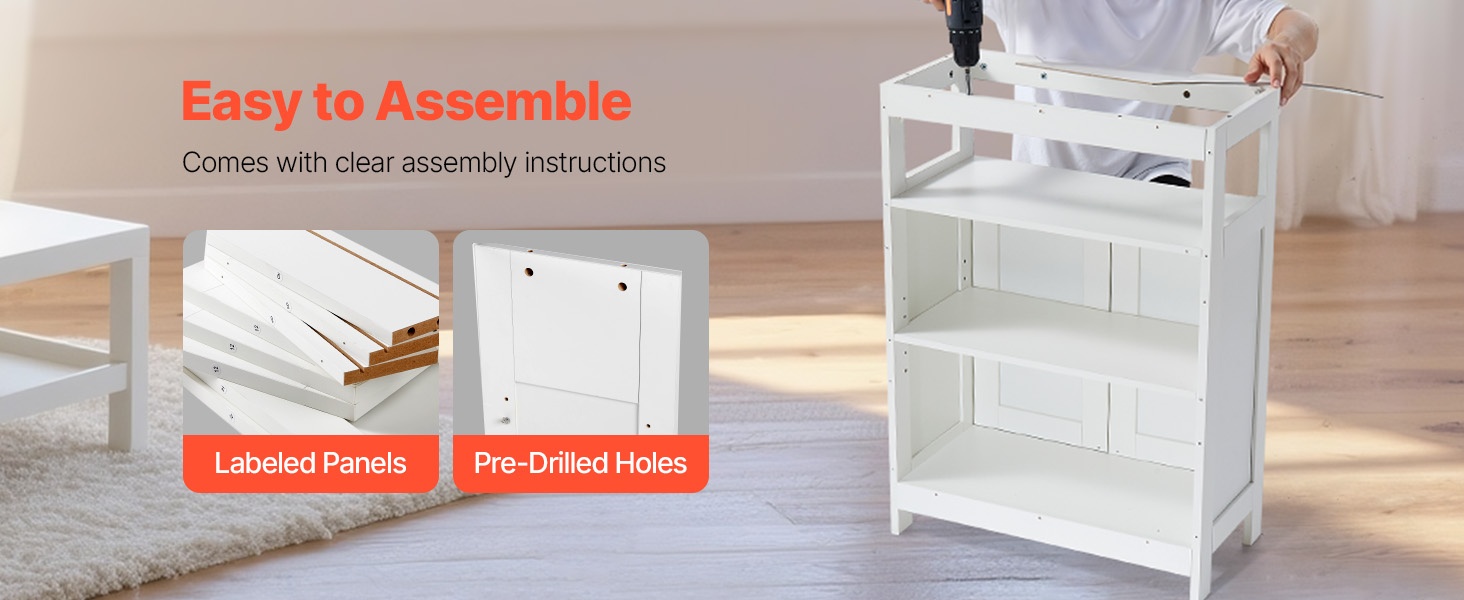 Vapaasti seisova kaappi toimitetaan kaikkien tarvittavien tarvikkeiden ja esiporattujen reikien kanssa. Jokainen osa on selkeästi numeroitu, mikä helpottaa ja nopeuttaa kokoamista.