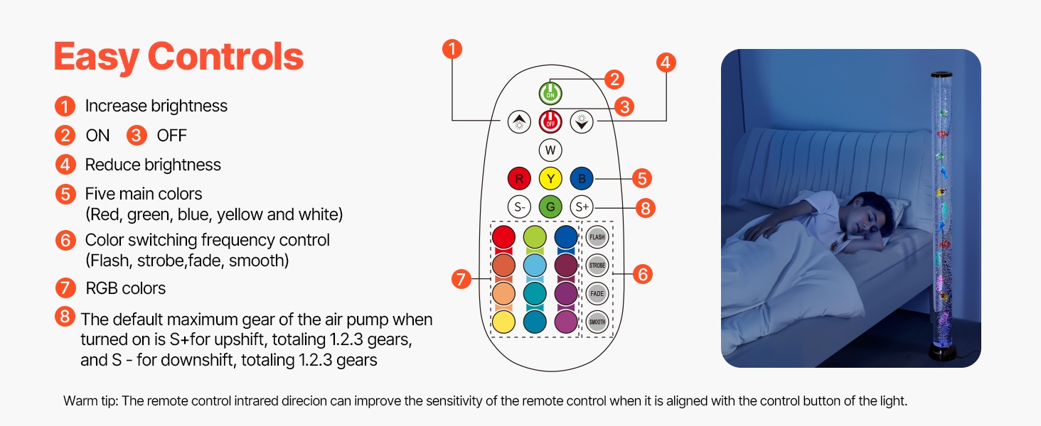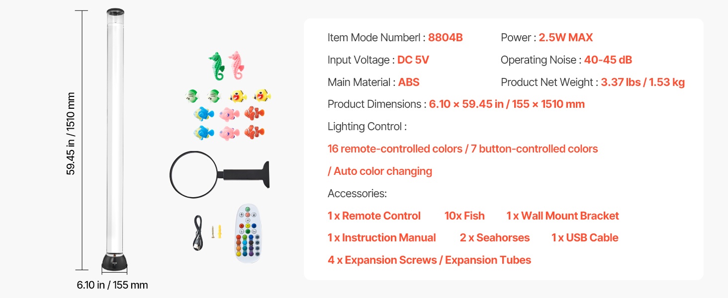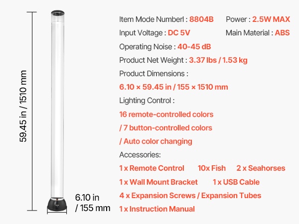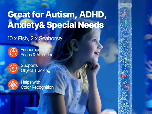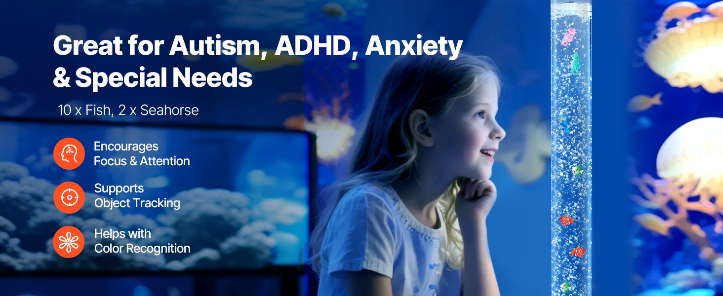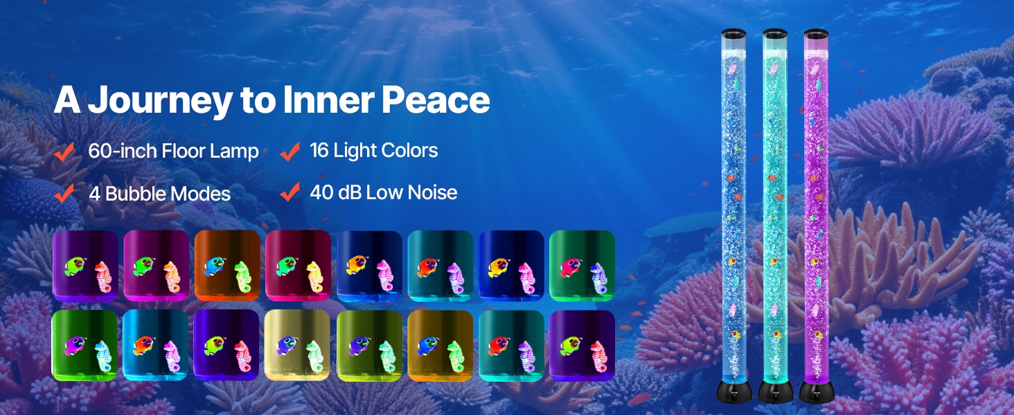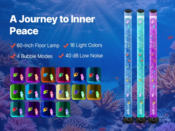 48-tuumainen (noin 120 cm) lattialla seisova kuplalampun ja akvaarion yhdistelmä luo rauhoittavan vedenalaisen tunnelman kotiin, toimistoon, aulatiloihin tai aistihuoneeseen. 16 eri valoväriä ja hiljainen käyntiääni tekevät siitä miellyttävän käyttää niin päivällä kuin illalla.