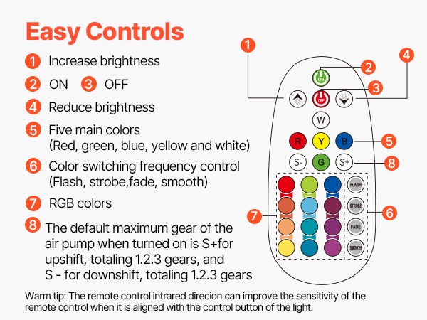 Valaisimessa on 16 kaukosäätimellä ohjattavaa väriä, 7 painikkeilla ohjattavaa väriä sekä automaattinen värinvaihto. Voit valita tunnelmaan sopivan värin tai antaa värien vaihtua itsestään.