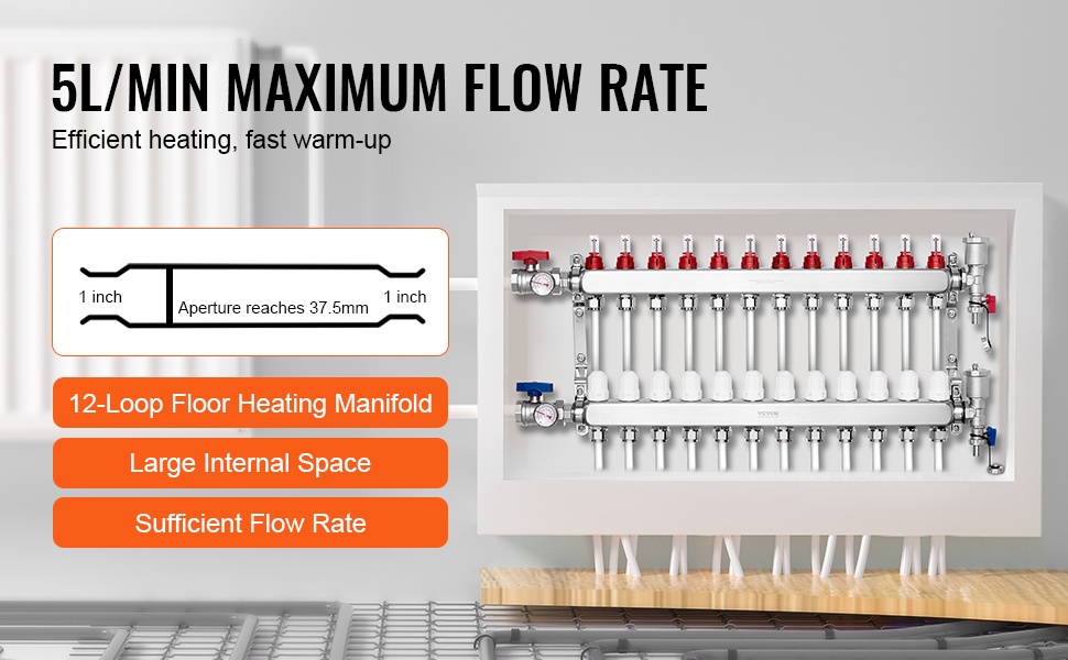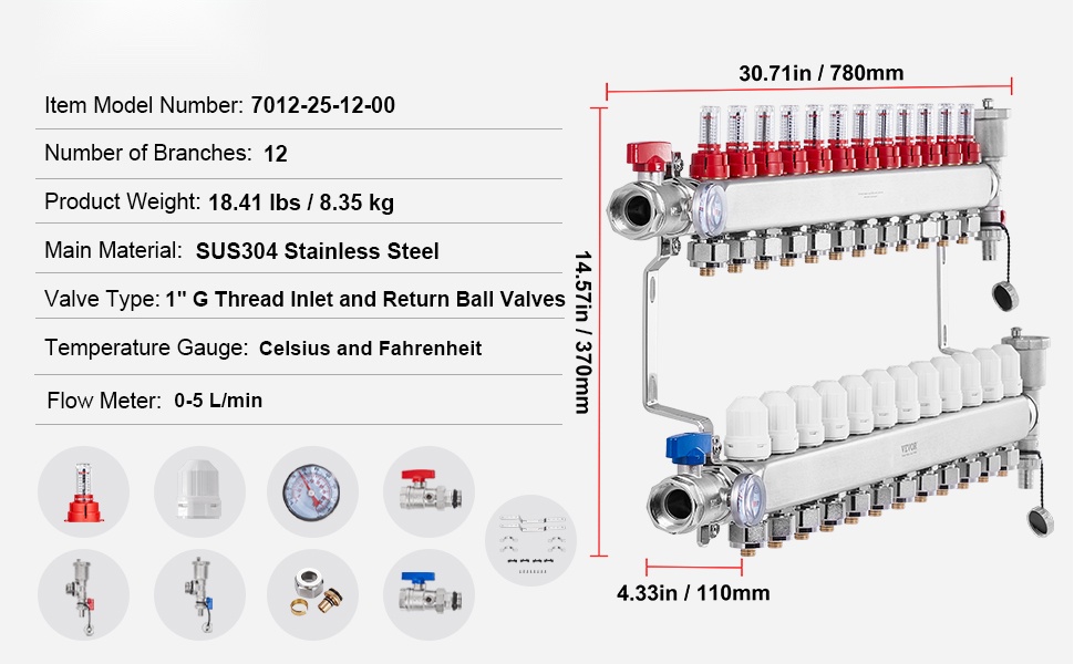 Tulohaaraan sijoitetut virtausmittarilliset sulkuventtiilit mahdollistavat jokaisen piirin vesivirran tarkan säädön ja ehkäisevät epätasaisen lämmönjakautumisen. Kaksi lämpömittaria näyttää lämpötilan sekä Fahrenheit- että Celsius-asteikolla, mikä helpottaa järjestelmän seurantaa.