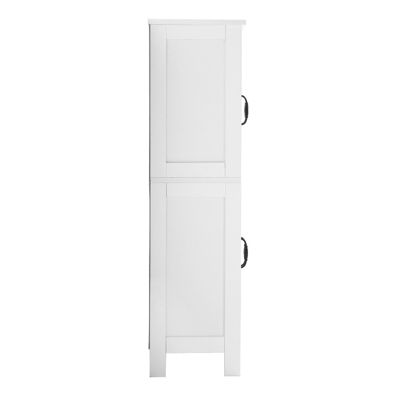 Tämä valkoinen puinen lattialla seisova kaappi tarjoaa neljä tasoa säilytystilaa ja auttaa pitämään kylpyhuoneen, eteisen tai olohuoneen siistinä. Kompakti koko mahtuu hyvin pieniin tiloihin, ja selkeälinjainen skandinaavinen ilme sopii monenlaiseen sisustukseen. Vesitiivis pinta on helppo pyyhkiä puhtaaksi.