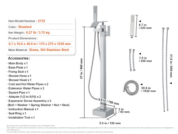 Tyylikäs lattialle asennettava kylpyammehana massiivimessinkirungolla ja 304-teräksisellä kaksitoimisella käsisuihkulla. Nopea 6.12L/min virtaus, korroosionkestävä, 360° juoksuputki, tahrankestävä viimeistely, vakaa rakenne, sopii vauvan ja lemmikin pesuun. Helppo asennus ja käyttö.