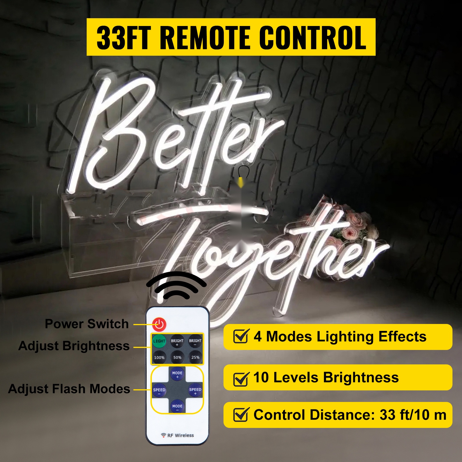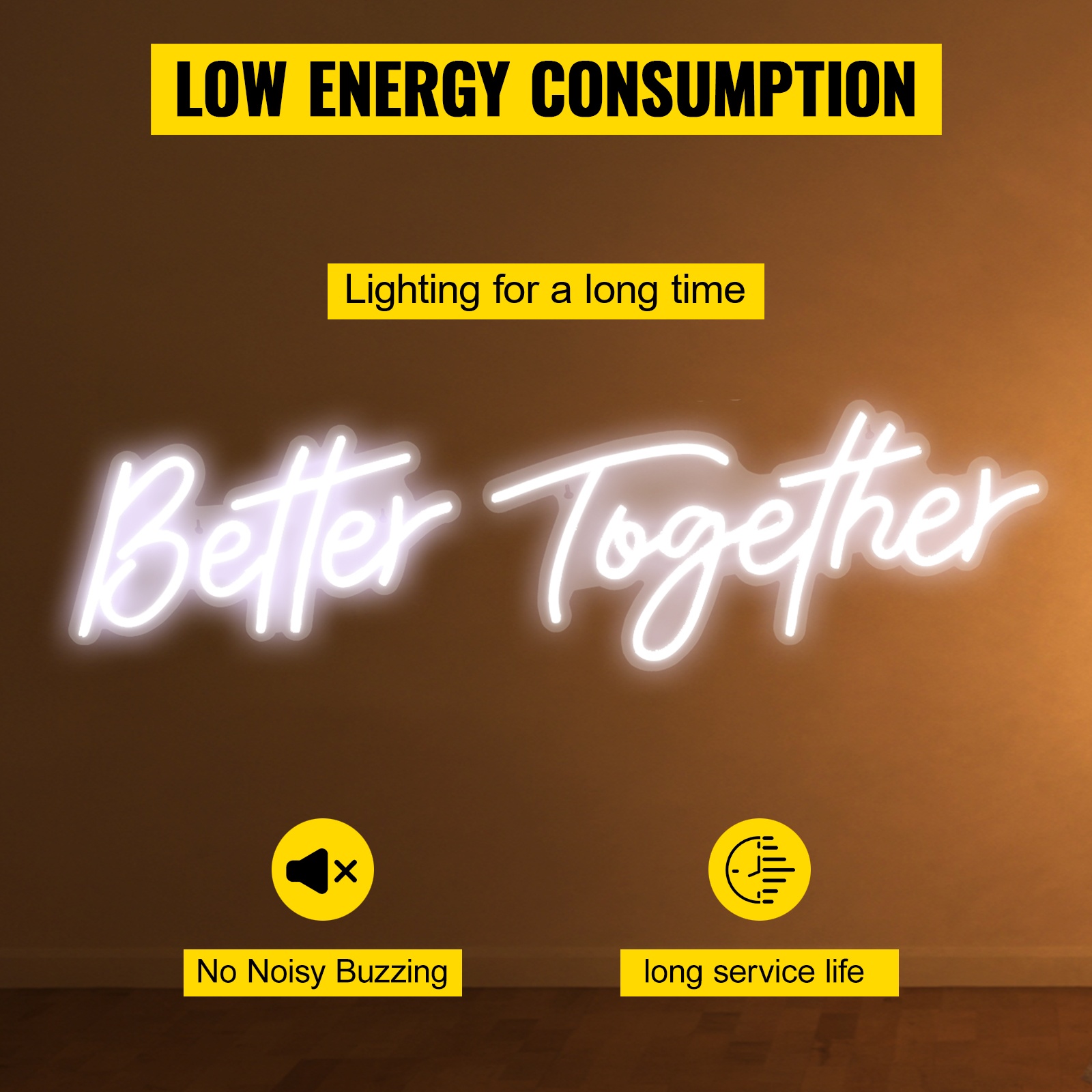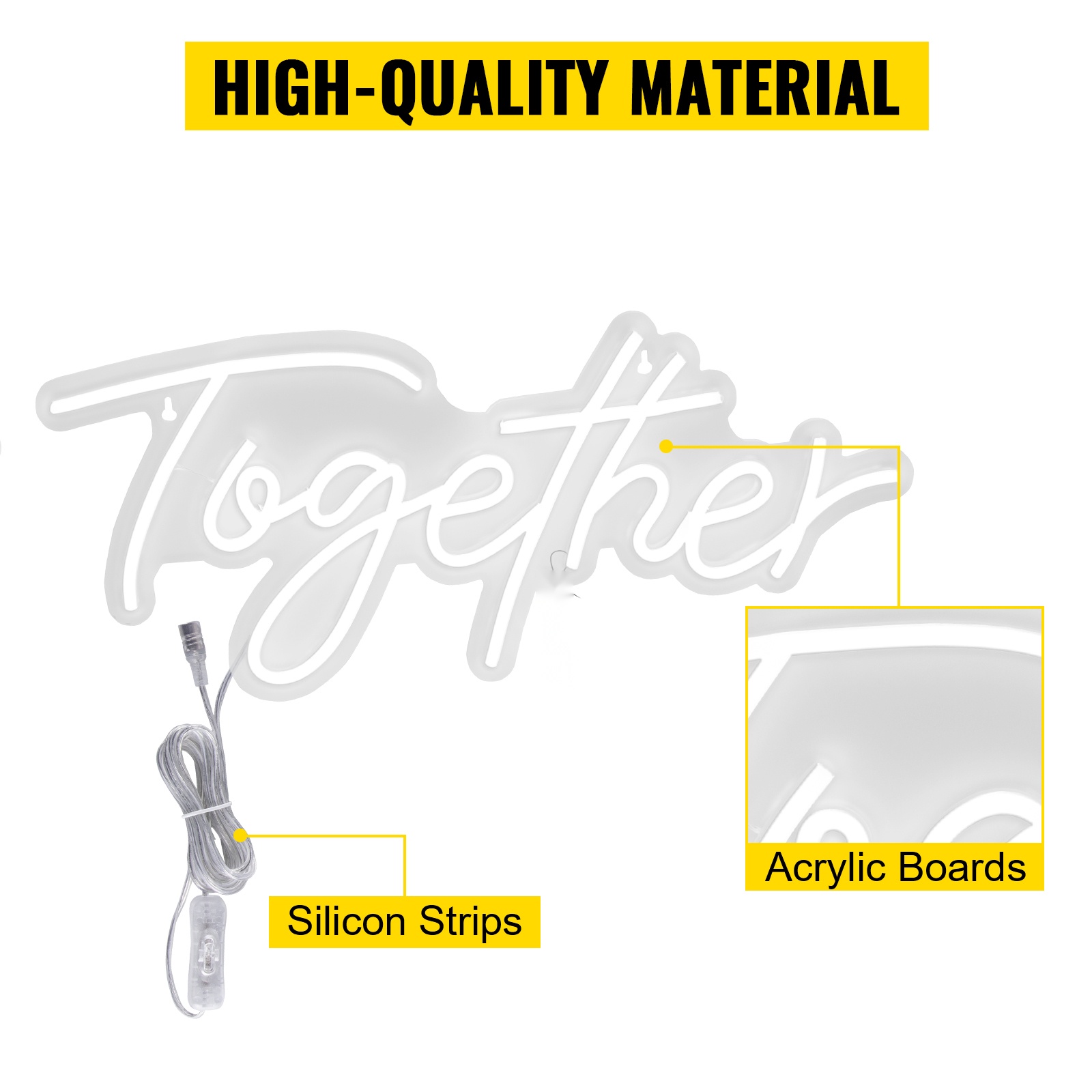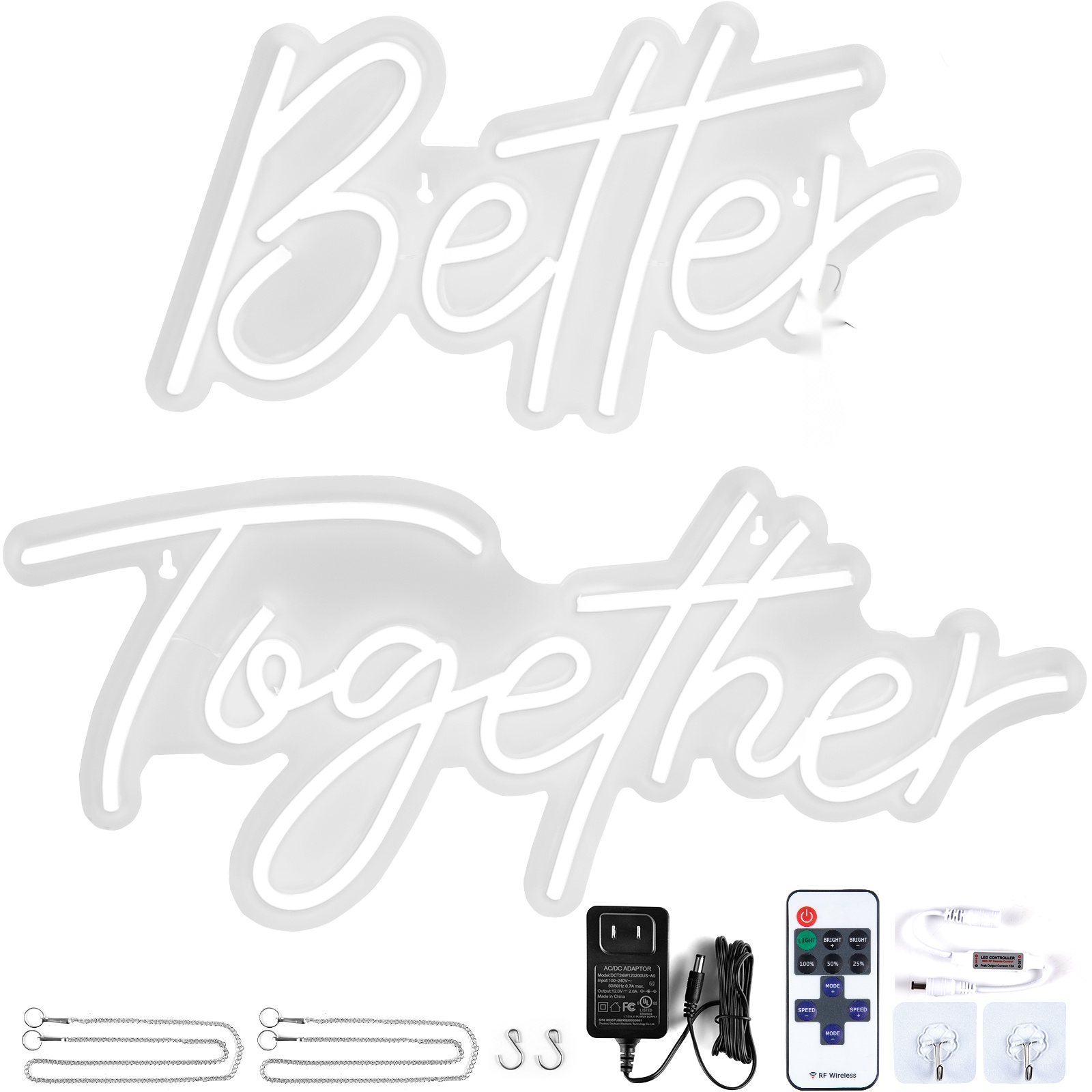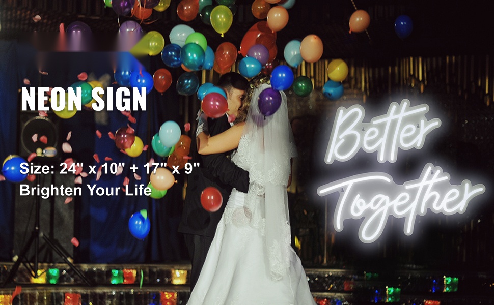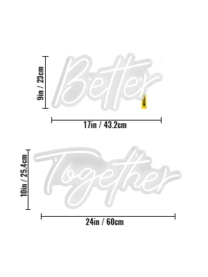 “Better” -osa on kooltaan 17" x 9" (43.2 x 23 cm) ja “Together” -osa 24" x 10" (61 x 25.4 cm). Kyltti on valmistettu silikoniputkesta ja läpinäkyvästä akryylitaustasta, mikä tekee siitä kirkkaan, turvallisen ja iskunkestävän verrattuna perinteisiin lasineonkylttihin.