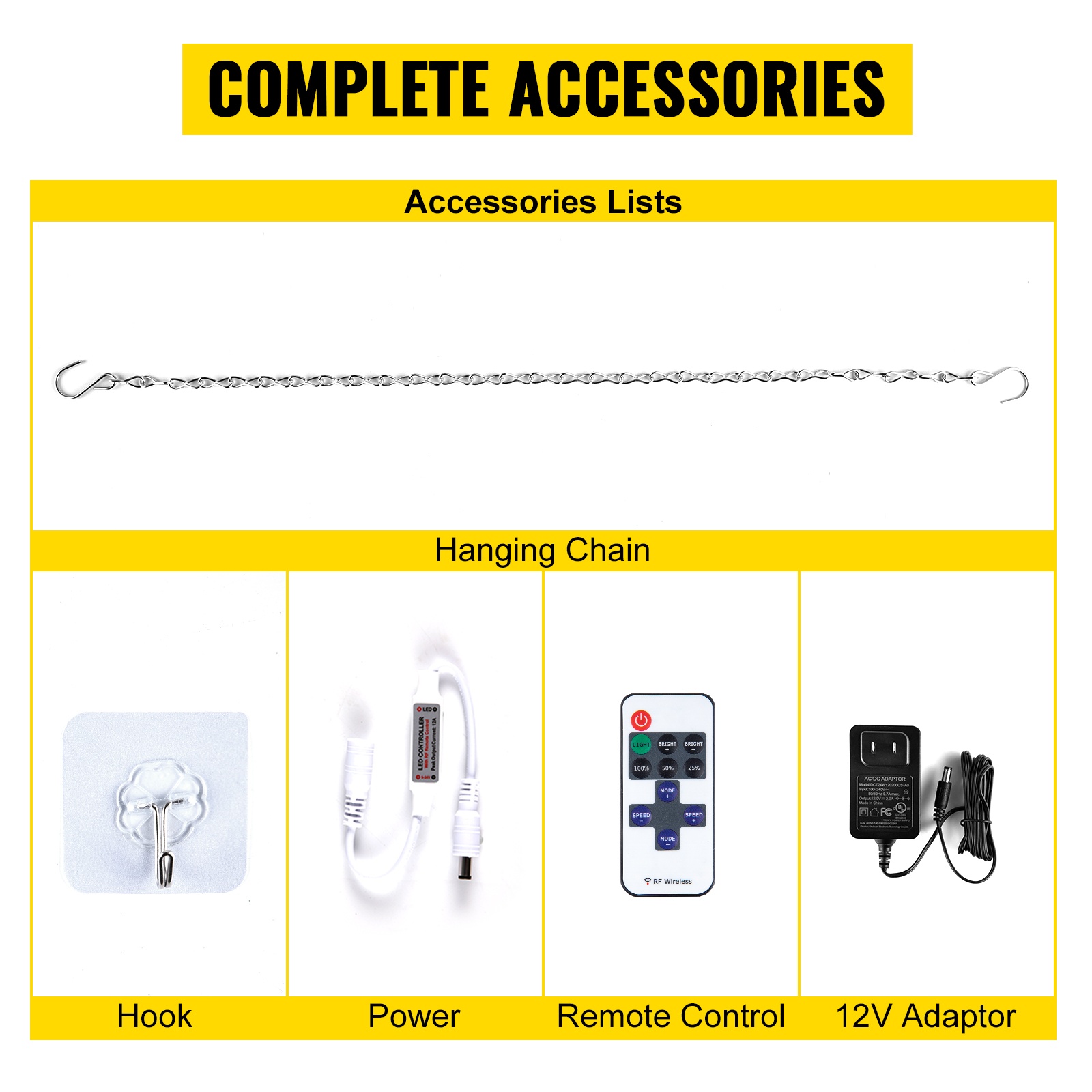 Pakkaukseen sisältyy kaikki tarvittava käyttöä ja ripustamista varten: kaukosäädin, 12V virtalähde, virtajohto, ketjut ja koukut.
