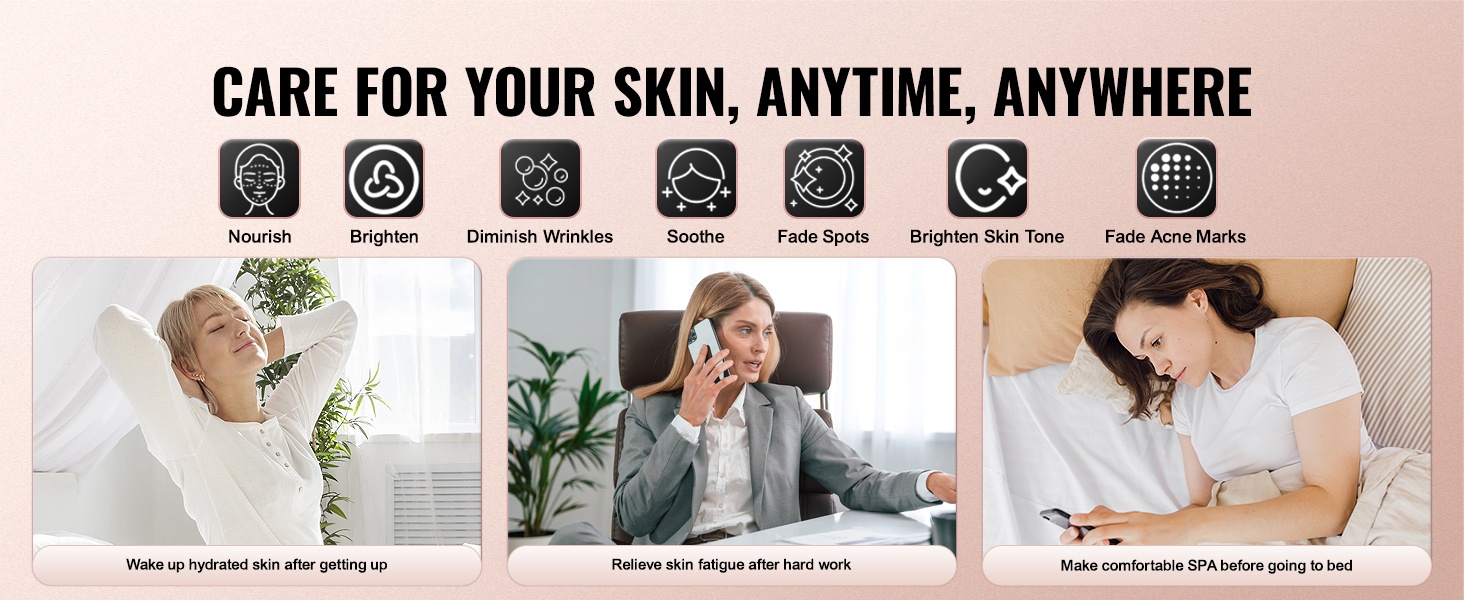 7-väriset valohoidot tarjoavat iholle miellyttävät luonnolliset valoaallot ja voivat tukea ihonhoitotuotteiden imeytymistä. Punainen valo (630nm), vihreä valo (520nm), sininen valo (470nm), keltainen valo (590nm), violetti valo (390nm), syaani valo (415nm–520nm) ja valkoinen valo.