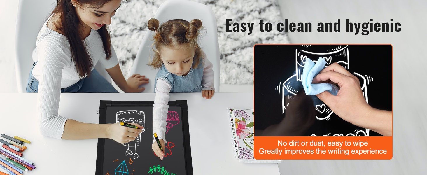 Toisin kuin perinteisissä liitutauluissa, tässä ei synny liitupölyä. Pinta on helppo pyyhkiä puhtaaksi, mikä tekee taulusta hygieenisen ja miellyttävän käyttää myös lasten piirustus- ja harjoituspintana.