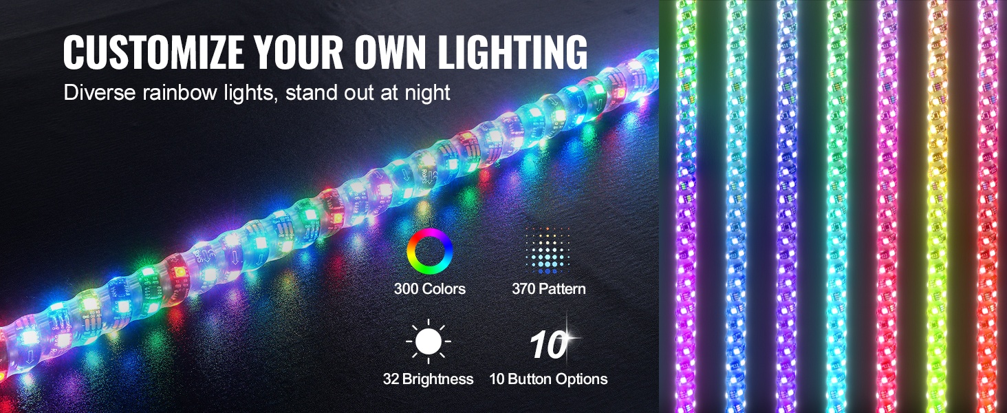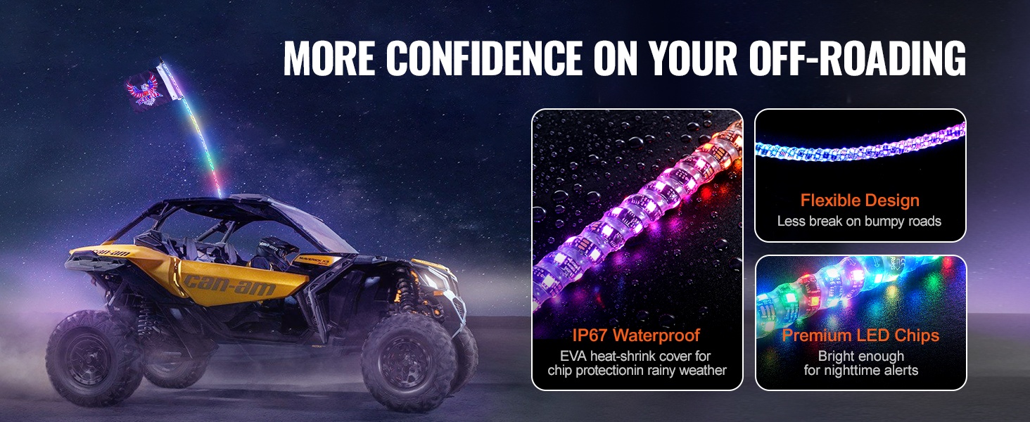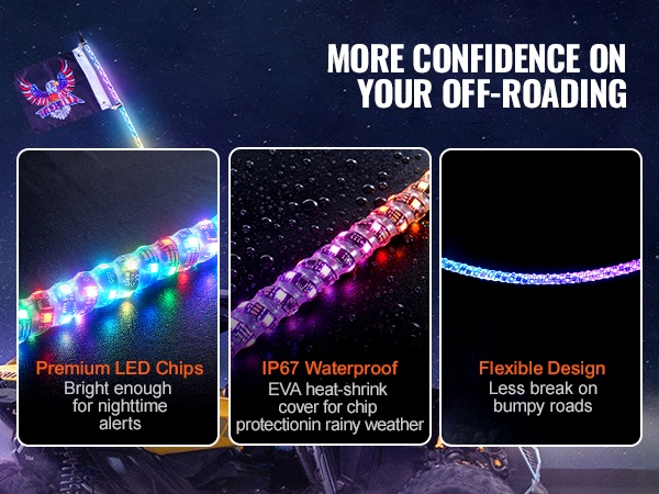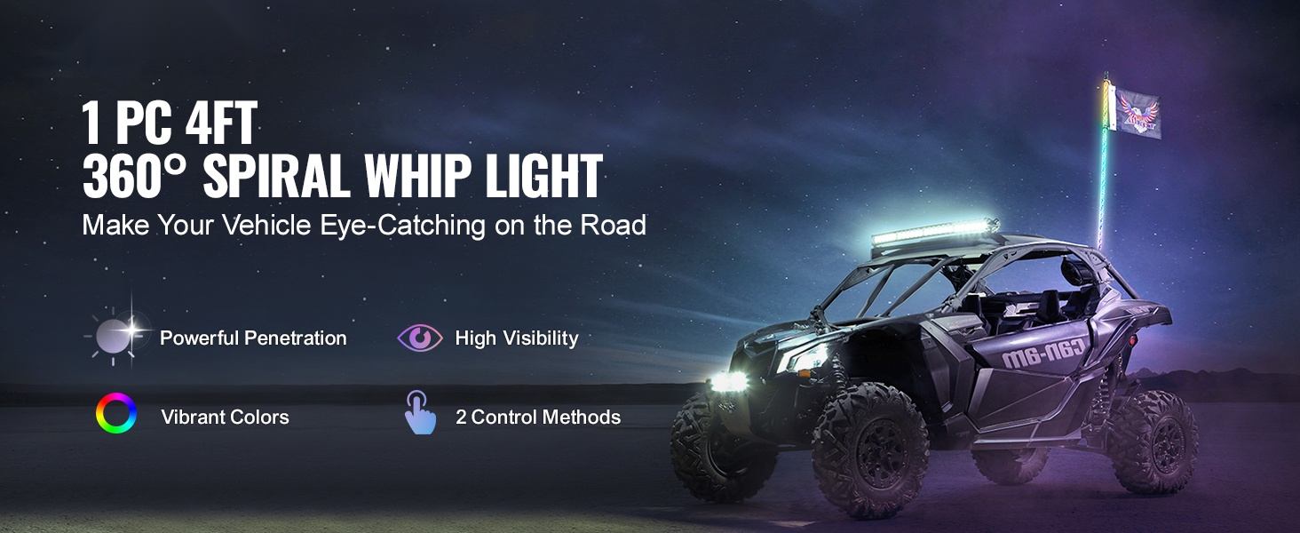 Whip-valot sopivat DC12V-24V ajoneuvoihin, kuten UTV:t, ATV:t, moottoripyörät, RZR:t, Can-am-ajoneuvot, lava-autot, off-road-ajoneuvot ja karting-autot. Näkyvyys paranee pimeällä ja maastoajossa, ja ajoneuvo erottuu selkeästi ympäristöstään.