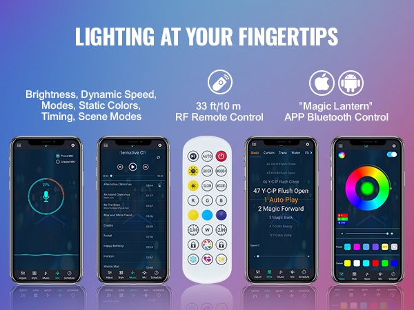 Valoja voi ohjata Bluetooth-sovelluksella, joka on yhteensopiva Android- ja IOS-järjestelmien kanssa. Puhelimesta tulee kätevästi kaukosäädin. Mukana tuleva RF-kaukosäädin toimii viiveettä jopa 33 ft/10 m etäisyydeltä, joten valaistuksen säätö onnistuu nopeasti ja tarkasti.