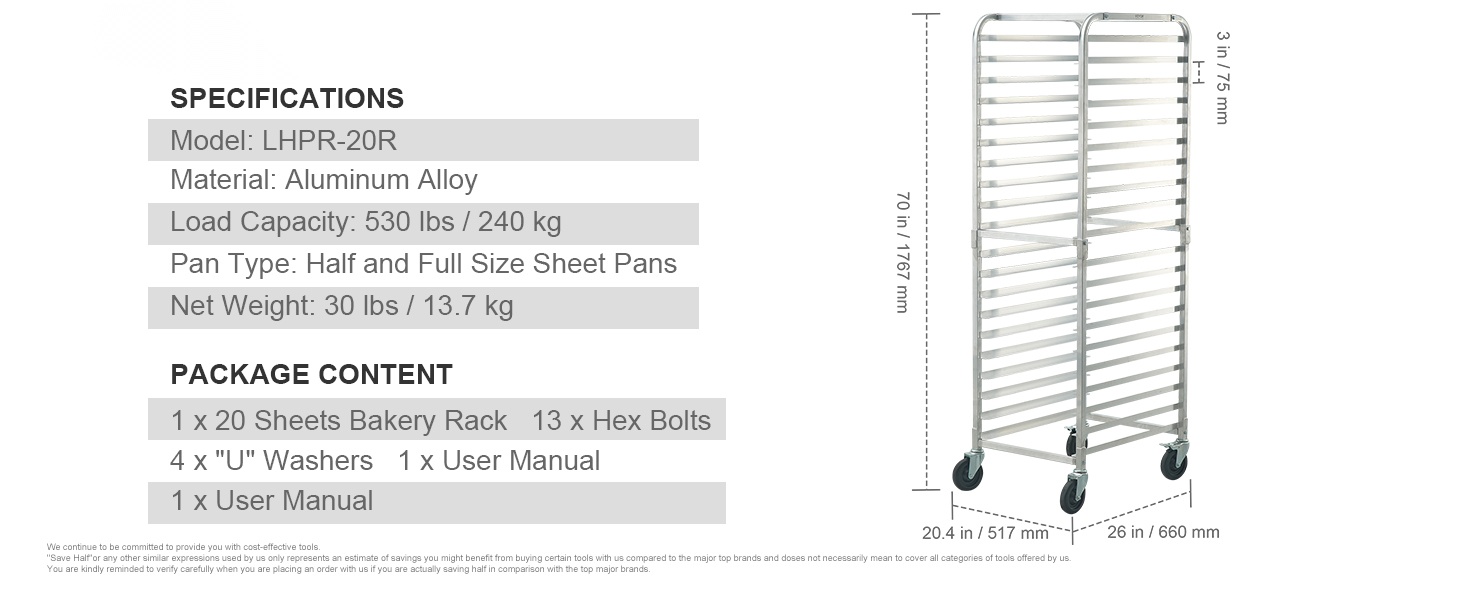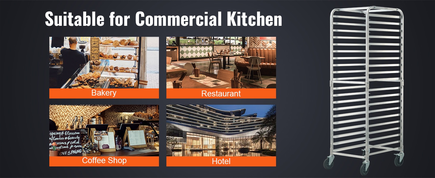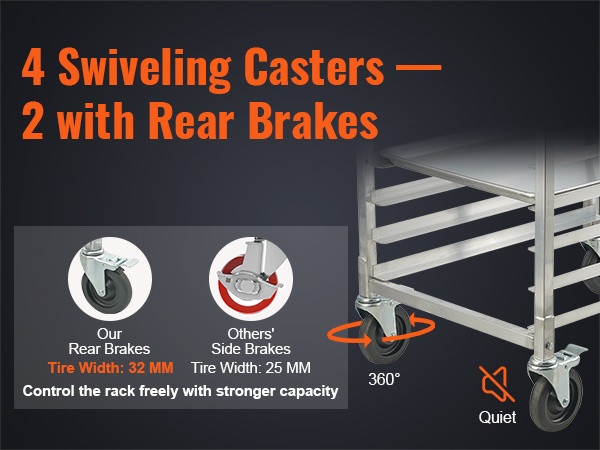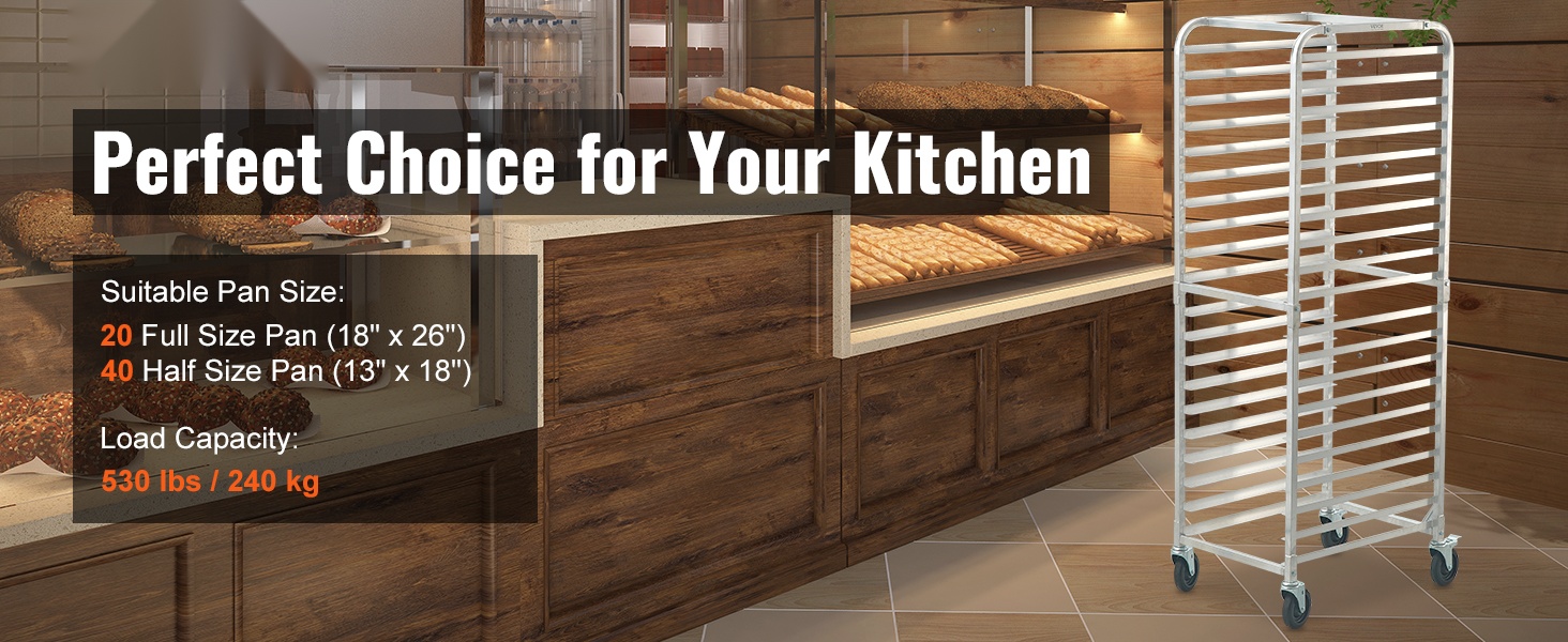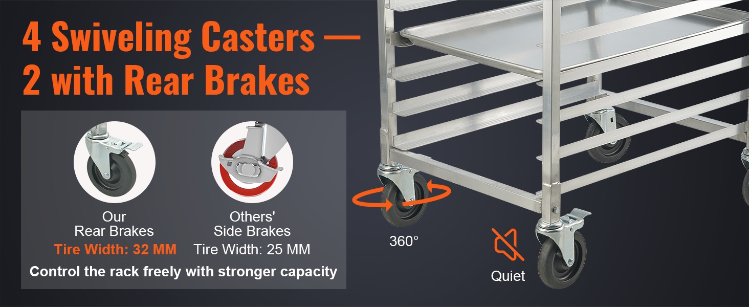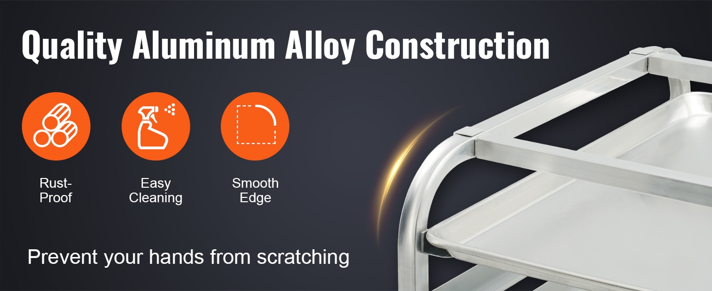 Tämä keittiön alumiininen tarjotinvaunu vetää jopa 10 täysikokoista tai 20 puolikokoista paistopeltiä, ja jokaisen tason kantavuus on 75 lb (kokonaiskantavuus: 530 lb). Tilaa riittää leivonnaisille ja muille valmistetuille ruoille. Lisäksi NSF-sertifiointi varmistaa korkean turvallisuustason.
