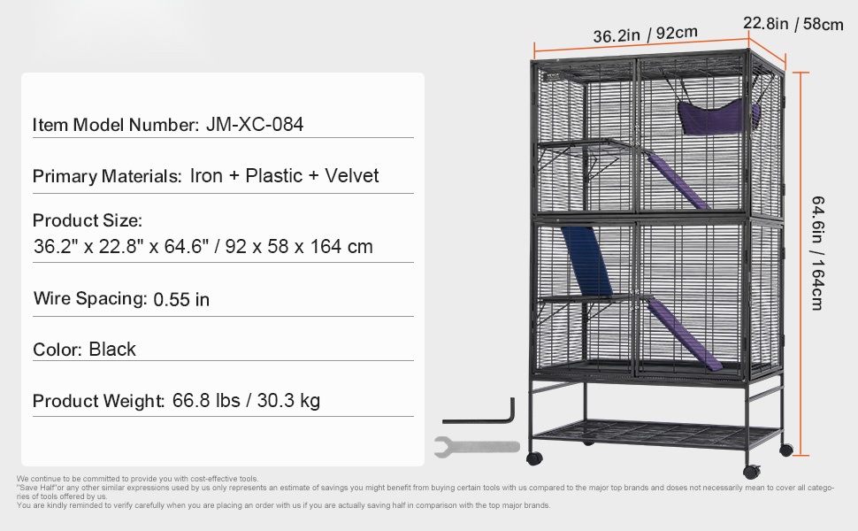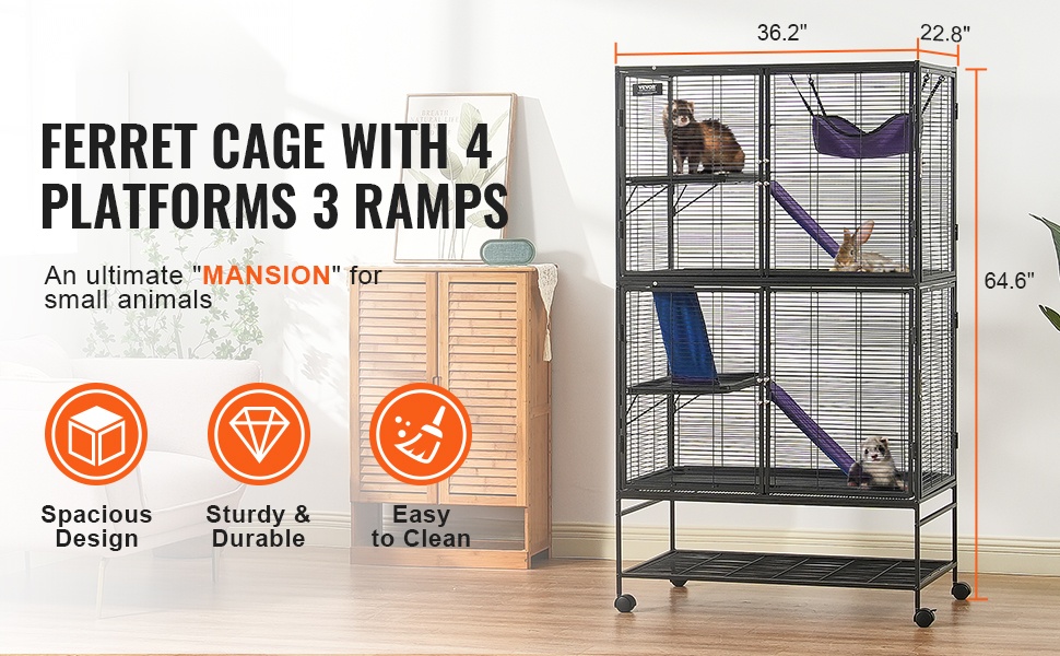 Tämä tilava lemmikkihäkki, kooltaan 36.2"x22.8"x39.4", tarjoaa kaksi eri korkeuksilla olevaa tasoa ja liukumattoman rampin. Se antaa lemmikeillesi runsaasti tilaa liikkumiseen ja leikkiin mukavasti ja turvallisesti.
