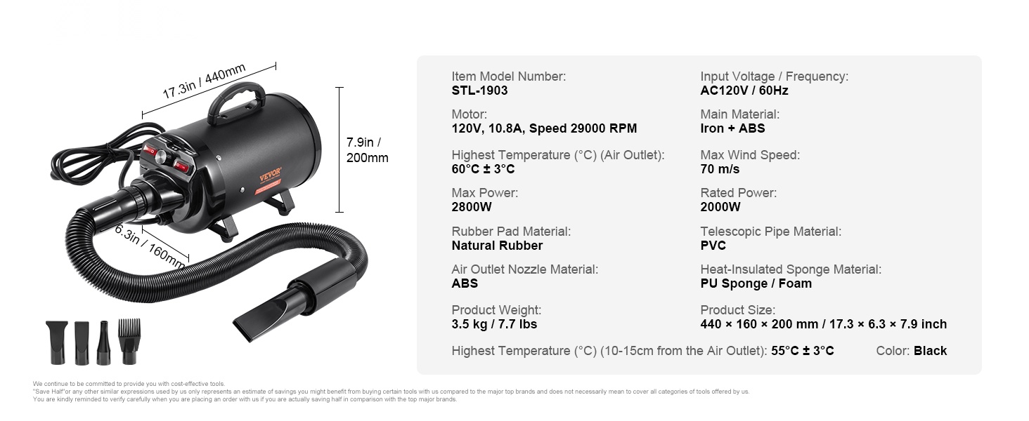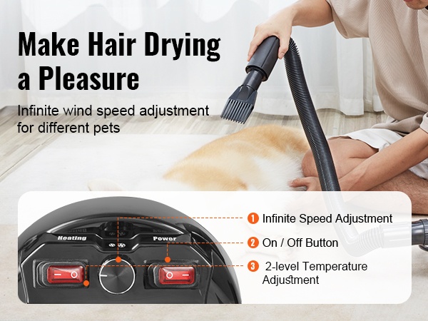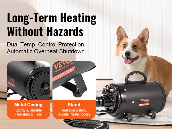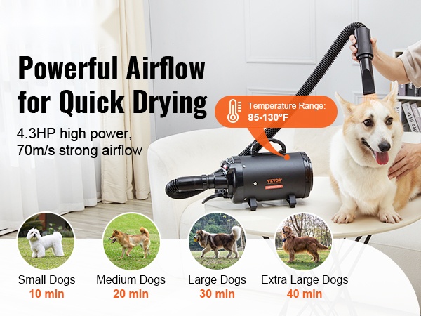 Tehokas 2000W/2.7HP lemmikkikuivain kuivaa koiran tai kissan turkin nopeasti ja tasaisesti. Maksimi ilmavirtaus on 70 m/s, ja säädettävä lämpötila-alue 85°F–130°F mahdollistaa sopivan lämmön erikokoisille ja eri turkkityyppisille lemmikeille.