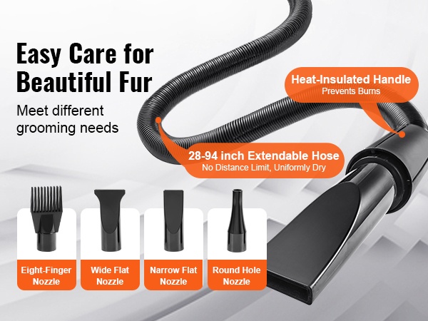 Pituudeltaan säädettävä letku helpottaa lemmikin eri alueiden, kuten vatsan, tassujen ja hännän, huolellista kuivaamista. Neljä erilaista suutinta on tarkoitettu erilaisille turkeille ja kehon osille, mikä tekee kuivaamisesta täsmällisempää ja miellyttävämpää.