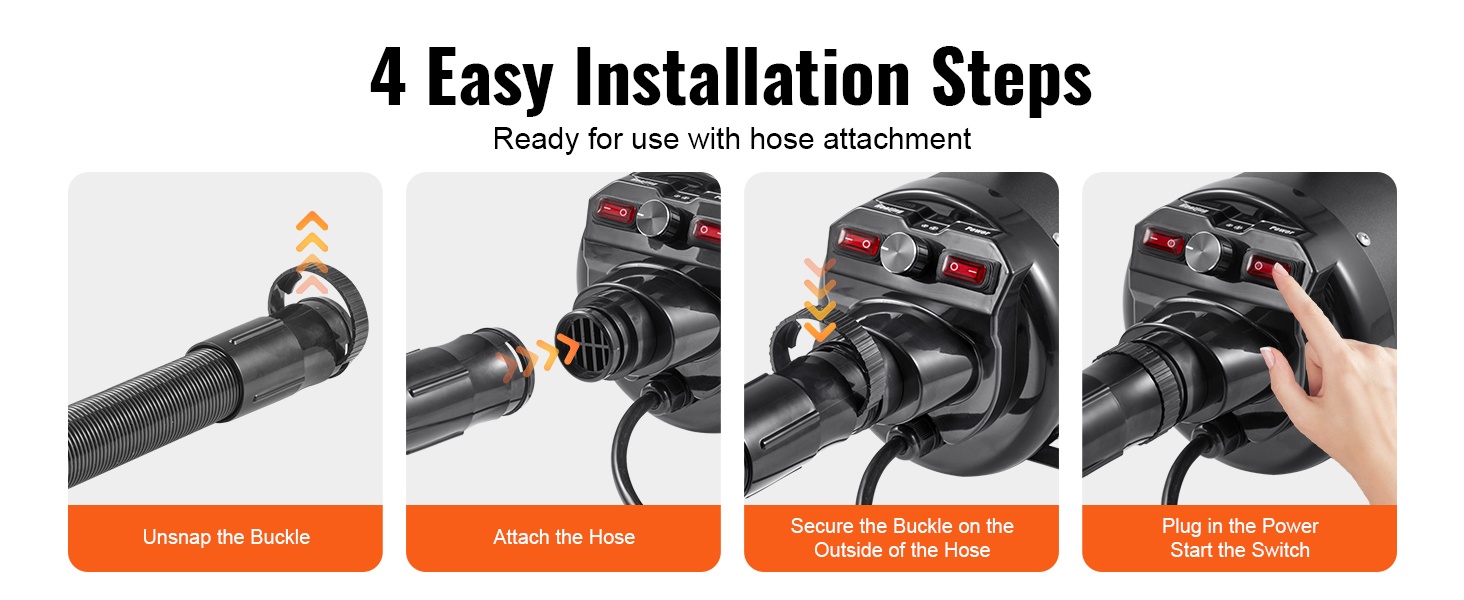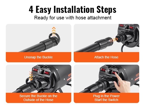 Käyttöönotto on yksinkertaista: liitä letku runkoon ja valitse sopiva suutin. Monimutkaisia asennusvaiheita ei tarvita.