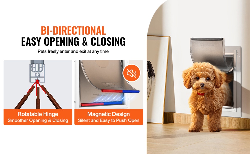 Erityinen sarana- ja läppärakenne mahdollistaa leveän avautumiskulman, jotta lemmikkisi voi kulkea ovesta kevyesti. Magneettitiiviste avautuu pienellä työnnöllä ja sulkeutuu takaisin, mikä auttaa pitämään vedon kurissa ja kulun sujuvana.