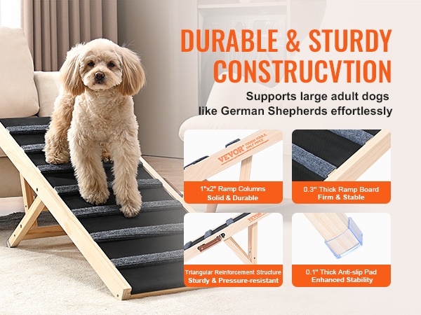Ramppi on valmistettu laadukkaasta mäntypuusta. Kolmiomainen rakenne ja pohjassa olevat liukuestejalat lisäävät vakautta, joten ramppi pysyy tukevasti paikallaan. Rakenne on niin tukeva, että se kestää hyvin myös raskaampaa kuormaa.