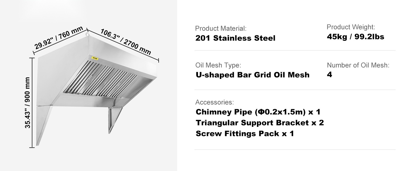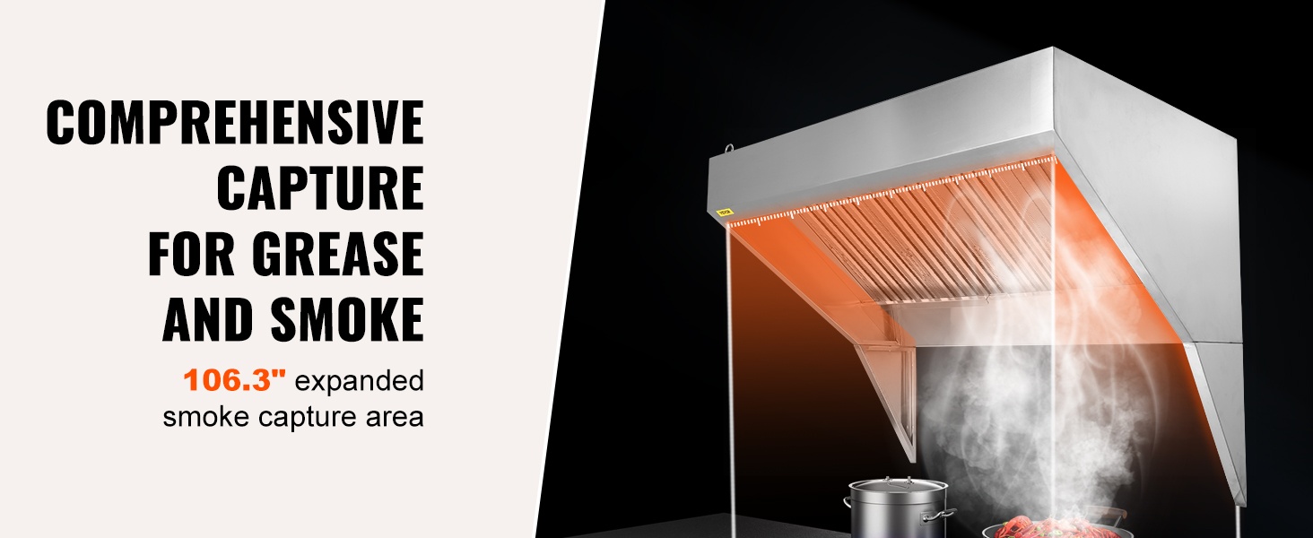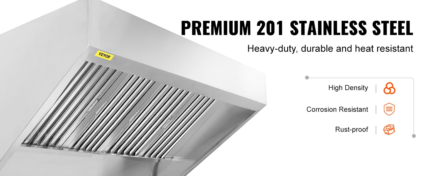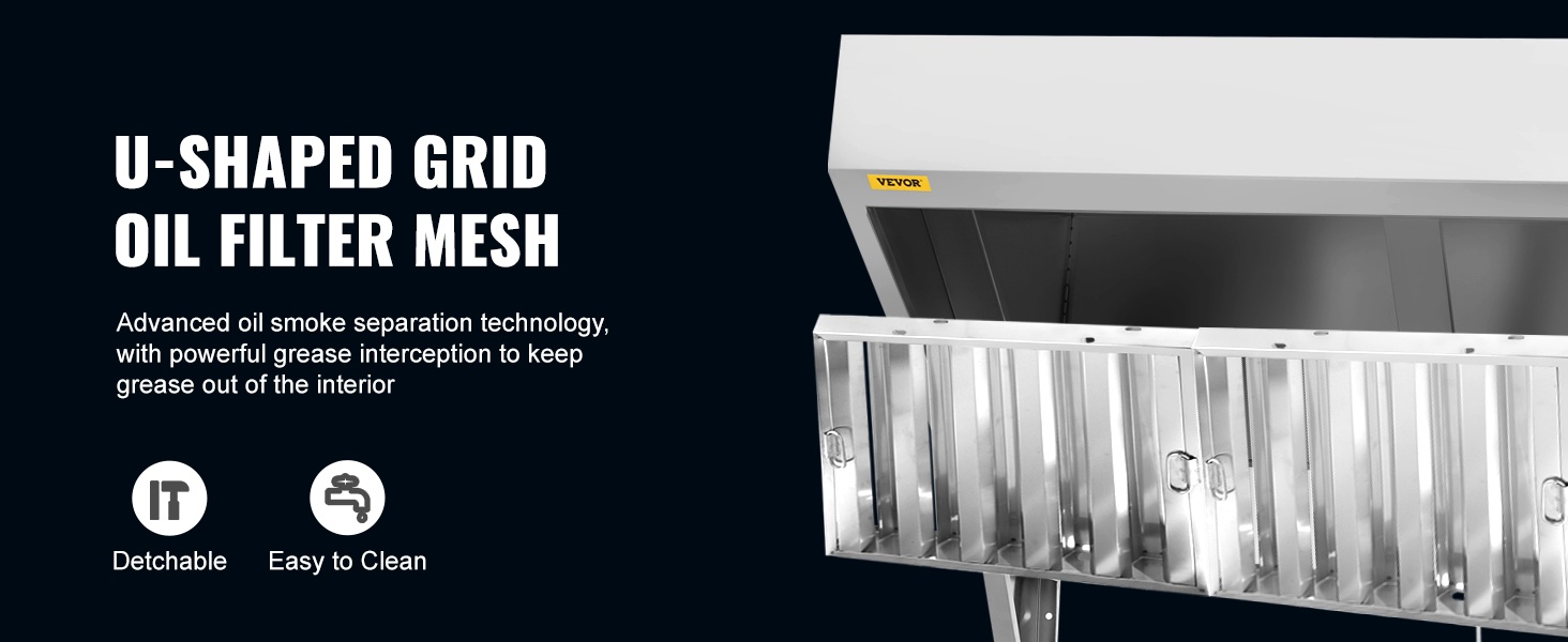 Tämä 201-ruostumattomasta teräksestä valmistettu kaupallinen liesikupu on suunniteltu tehostamaan savun ja hajujen poistoa ammattikeittiöissä, ravintoloissa ja ruokarekoissa. Laaja 59-tuumainen (n. 1.5 m) savun keräysalue ja parannetut U-muotoiset öljysuodatinverkot auttavat pitämään työtilan raikkaana ja miellyttävänä.